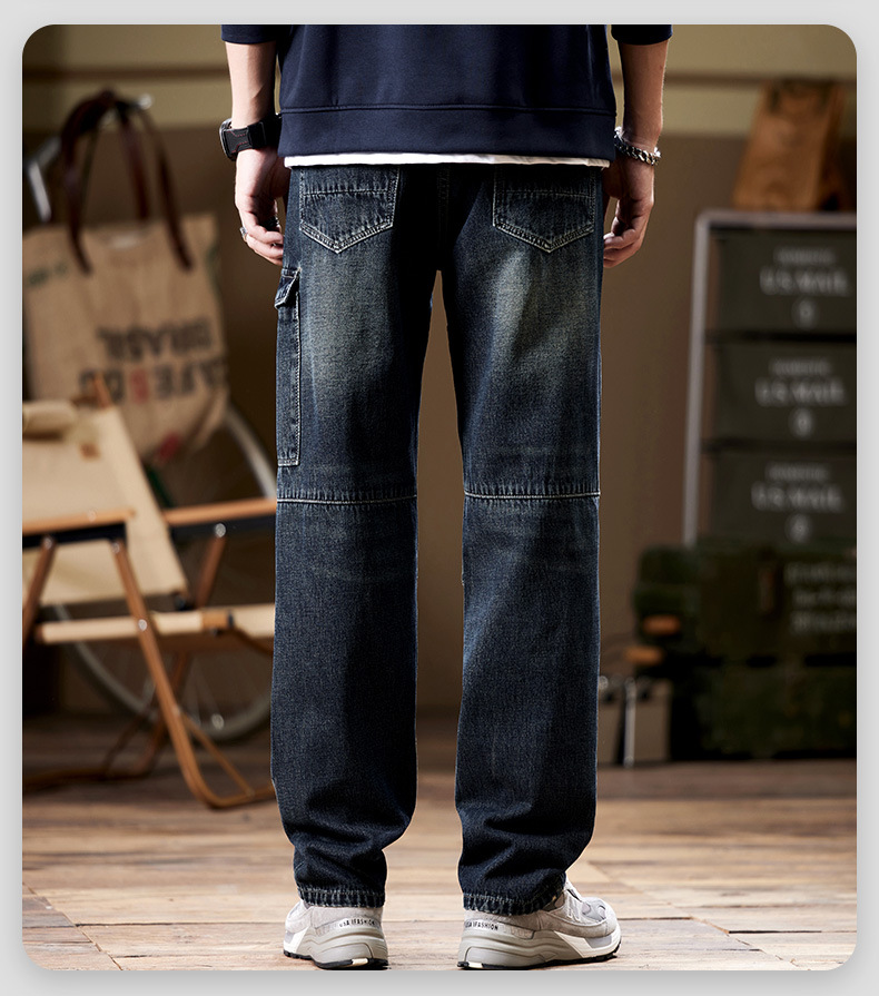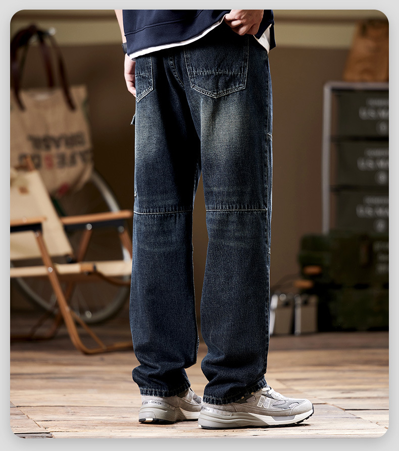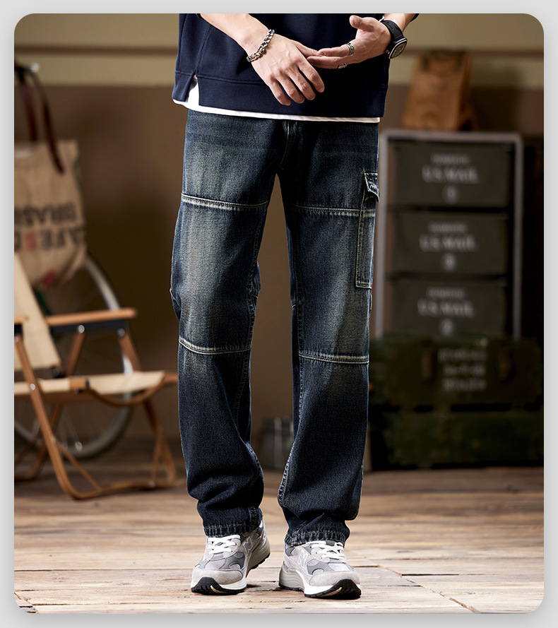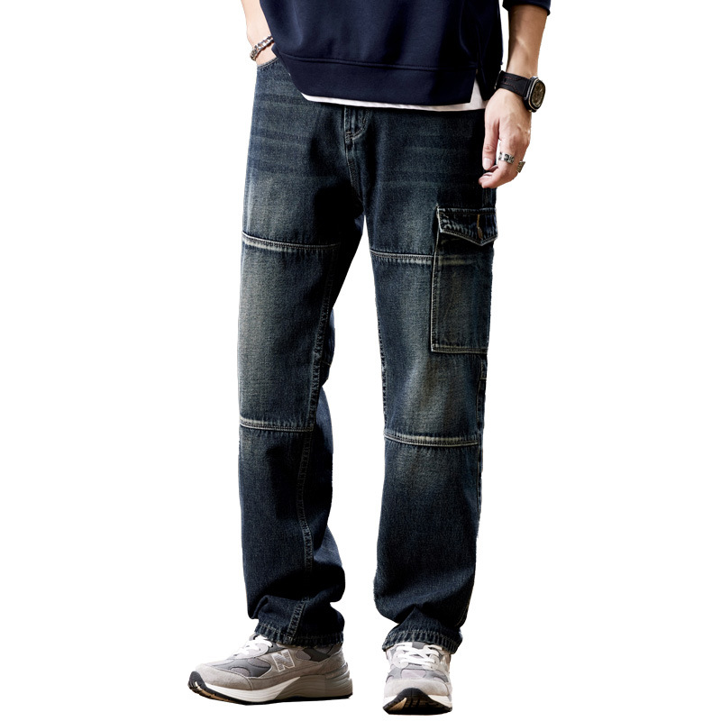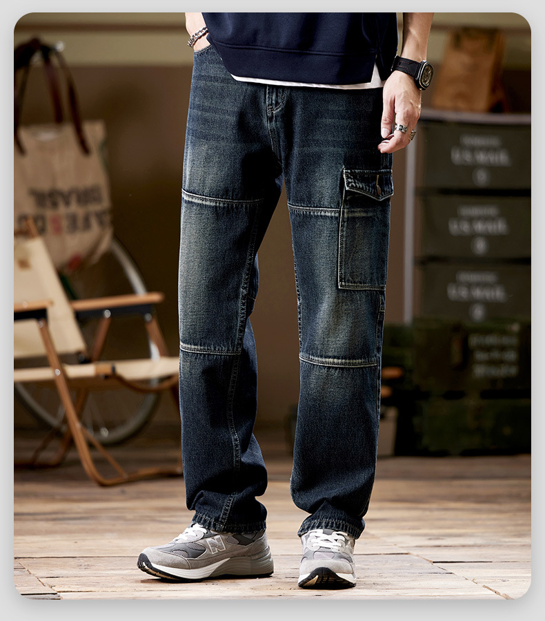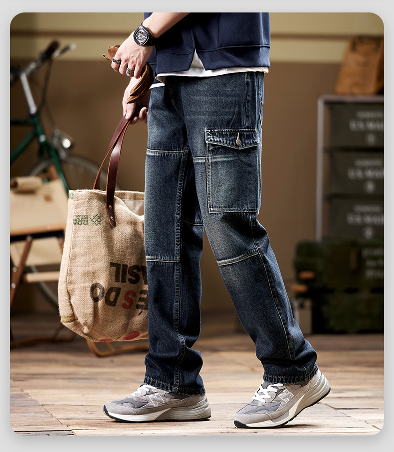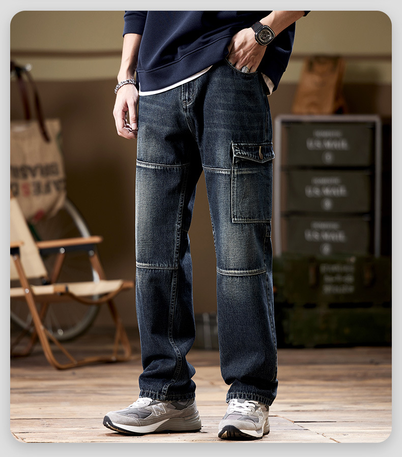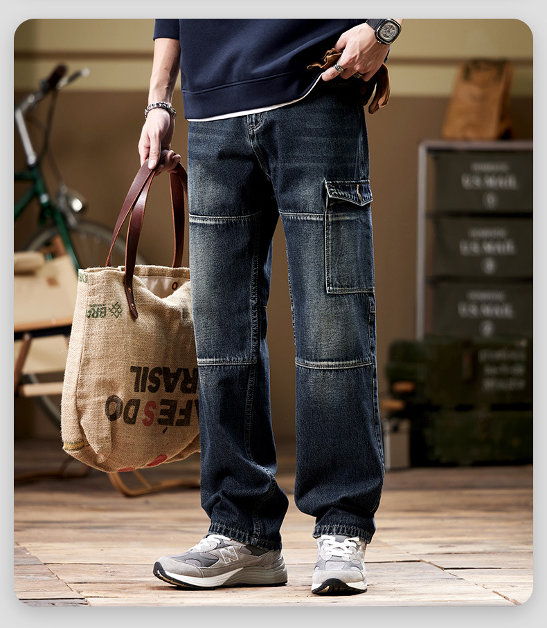 일본 복고풍 사료 청바지 남성 가을과 겨울 느슨한 플러스 사이즈 타이드 브랜드 멀티 포켓 스트레이트 팬츠