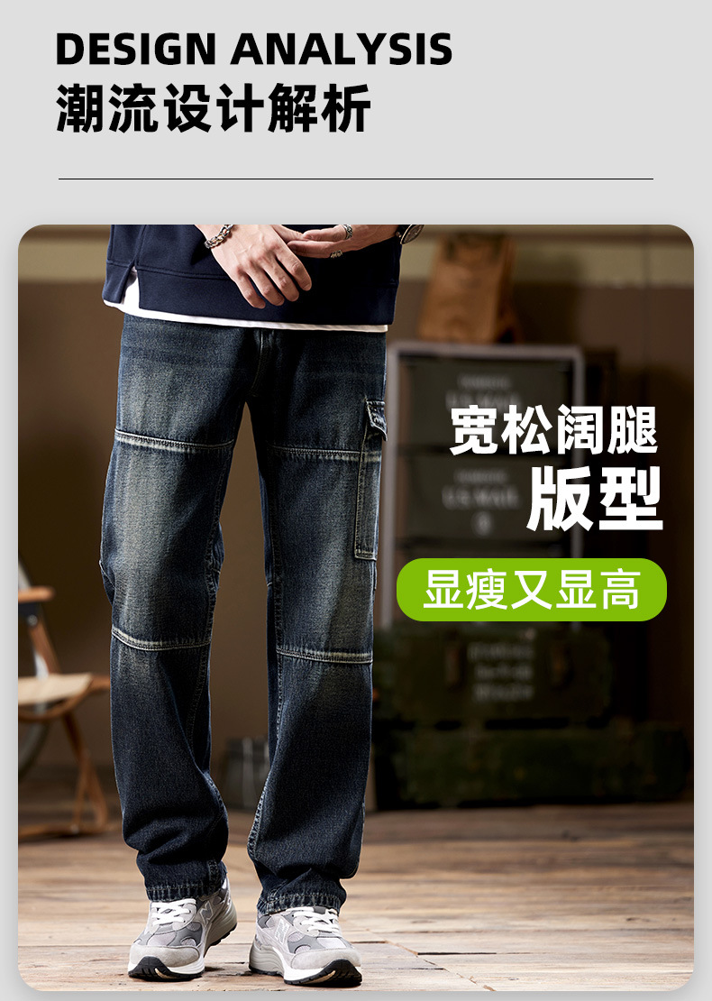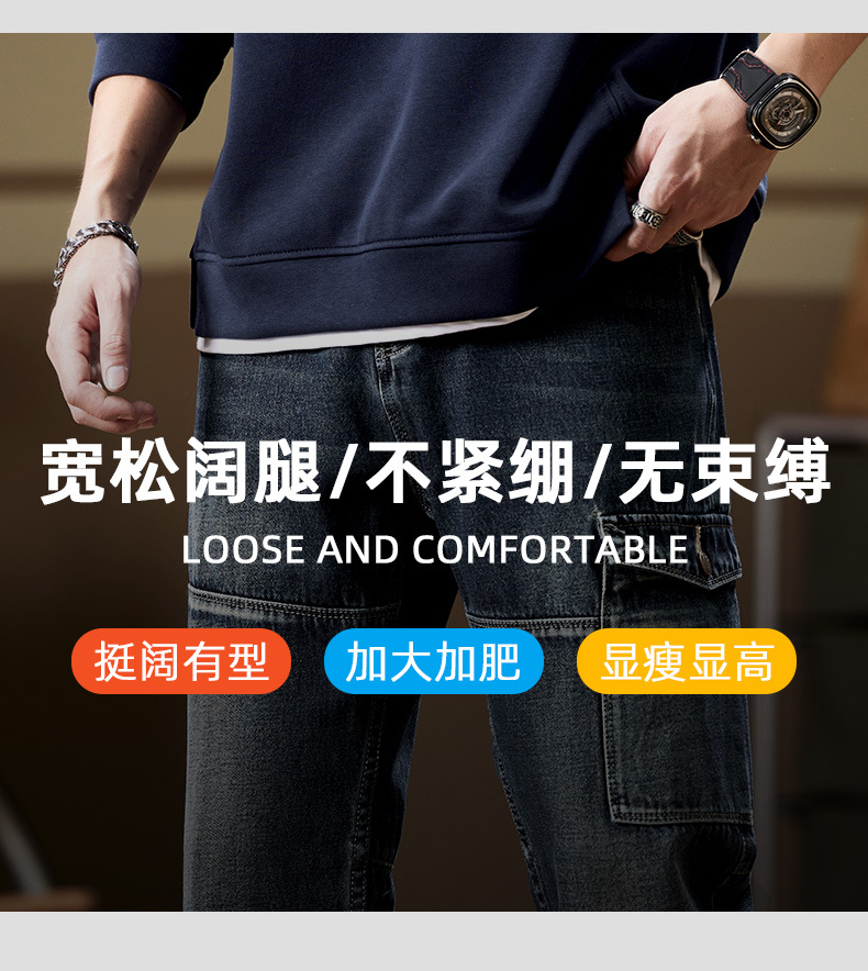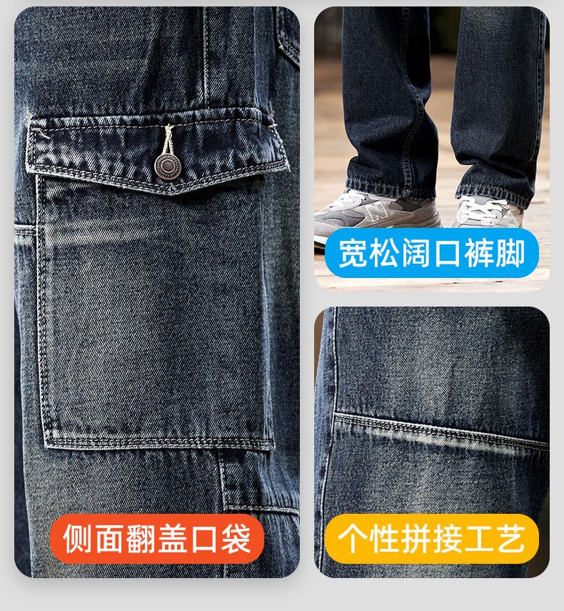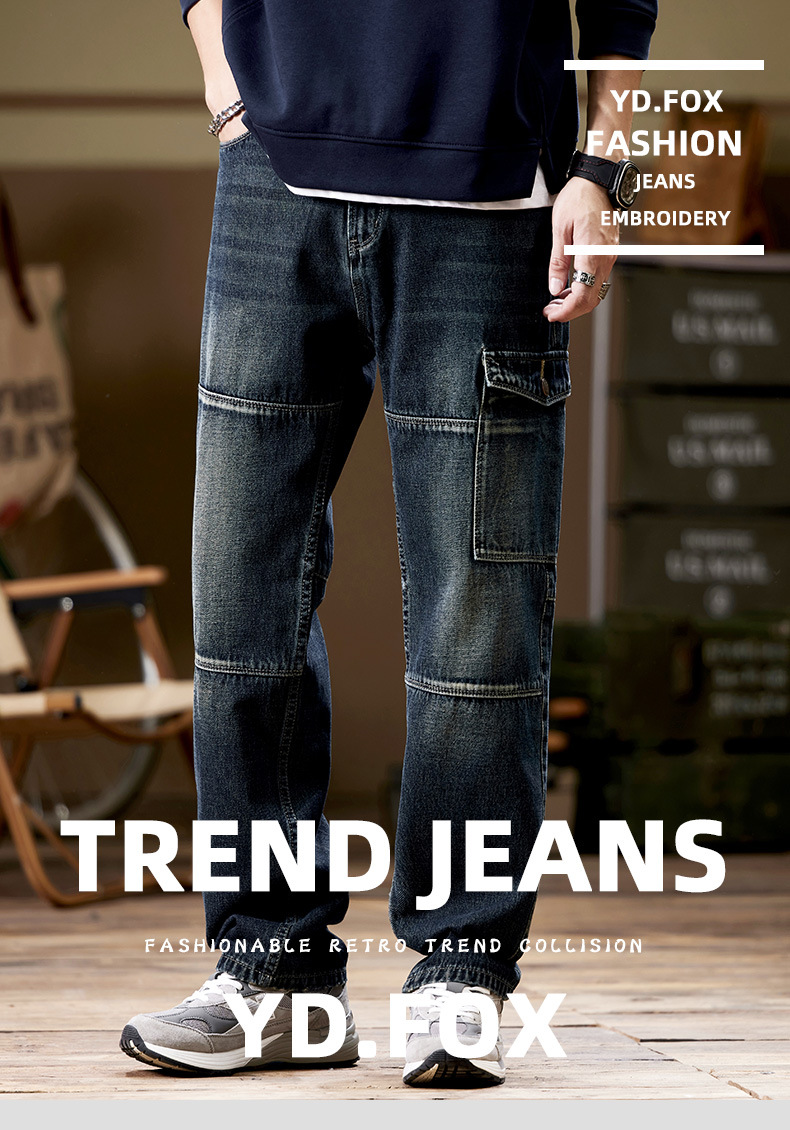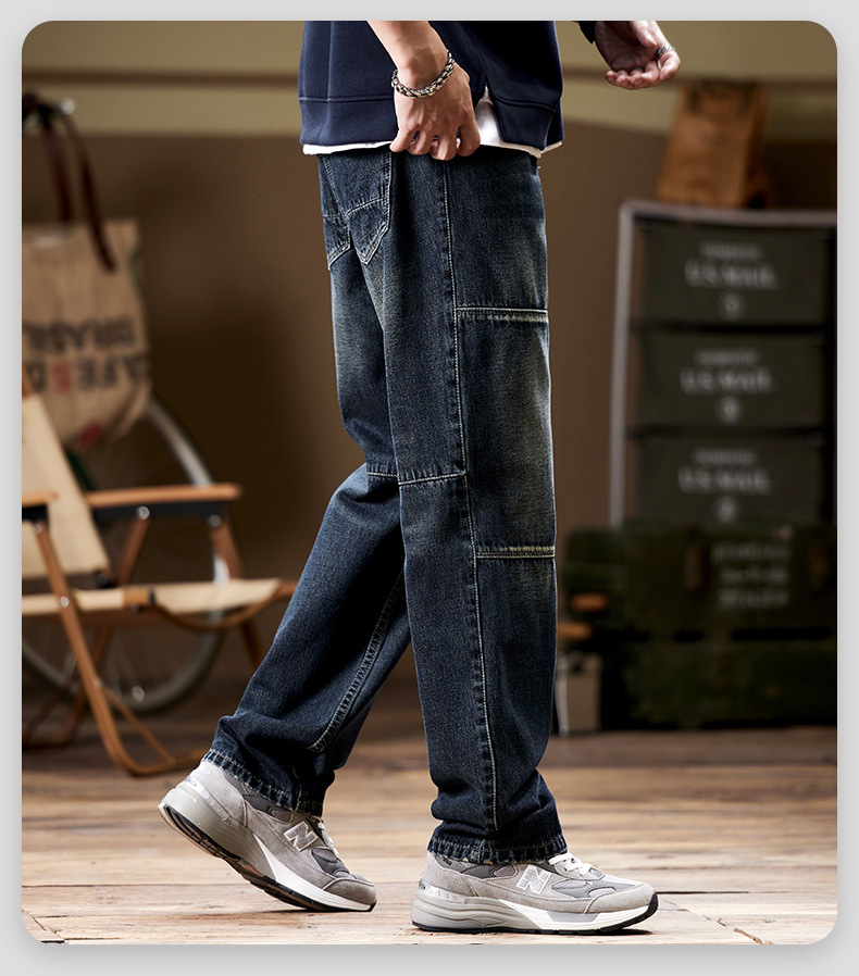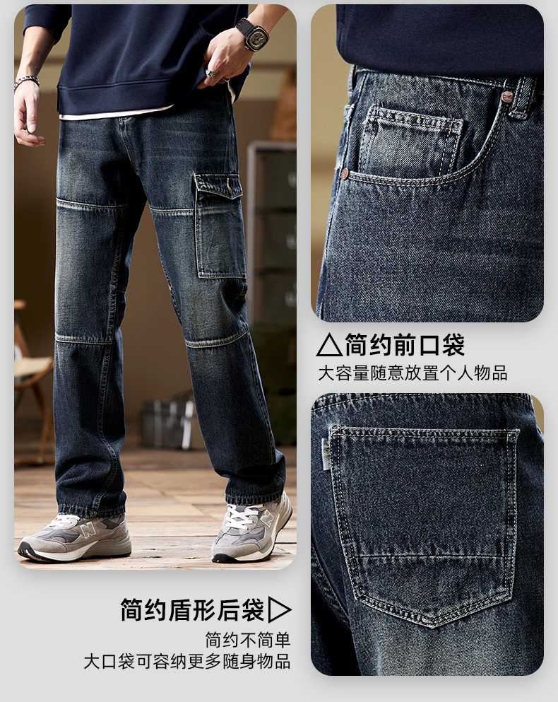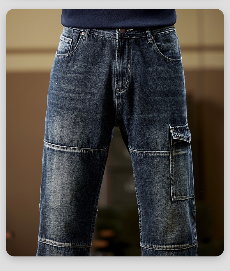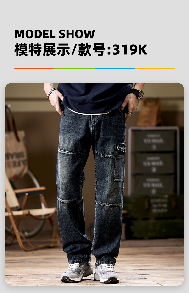 일본 복고풍 사료 청바지 남성 가을과 겨울 느슨한 플러스 사이즈 타이드 브랜드 멀티 포켓 스트레이트 팬츠