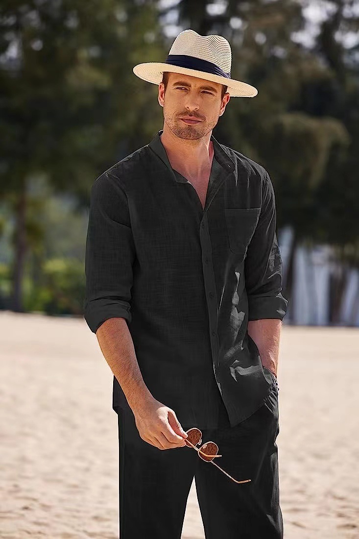 크로스 보더 유럽과 미국 스포츠 세트 남성용 비치 캐주얼 루즈한 세트 긴팔 셔츠 바지 작업복 대외 무역 투피스 세트