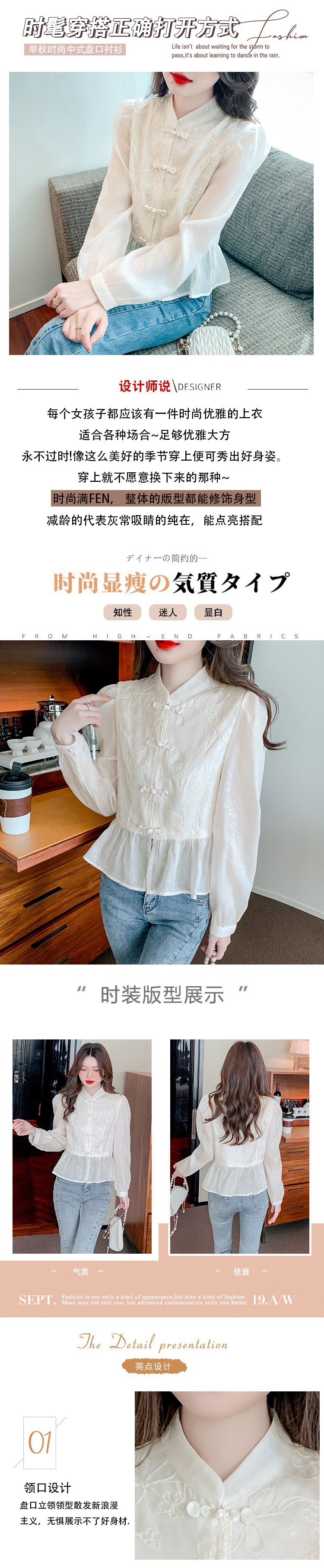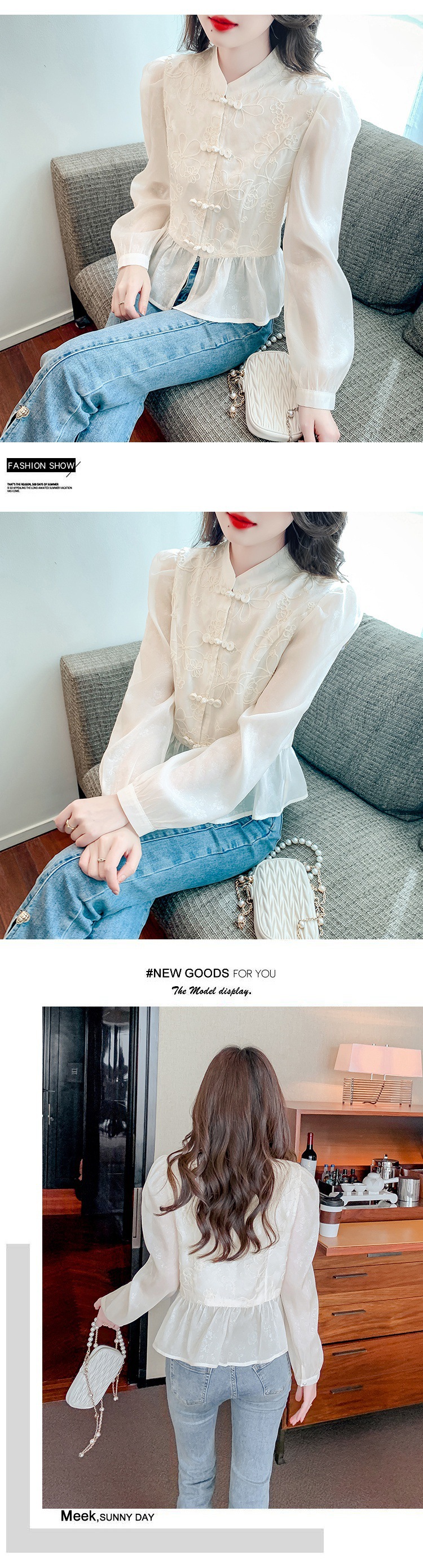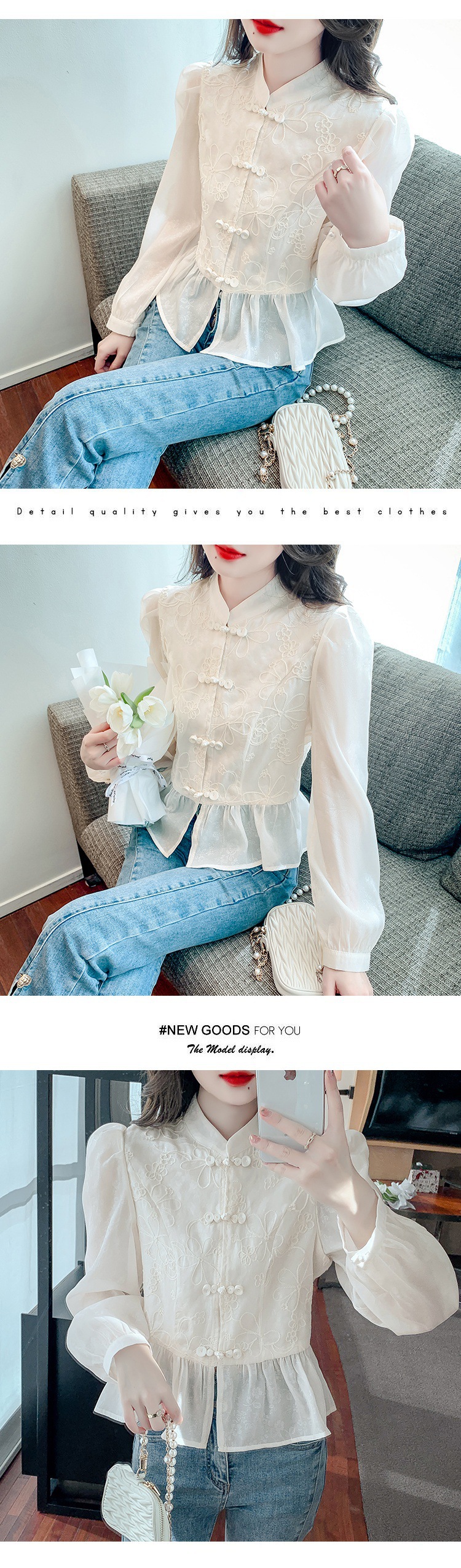 리얼 샷 재고 2023 가을 버튼 셔츠 여자의 내셔널 스타일 스탠드 칼라 쉬폰 셔츠 무거운 자수 얇은 세련된 탑스토어 가기