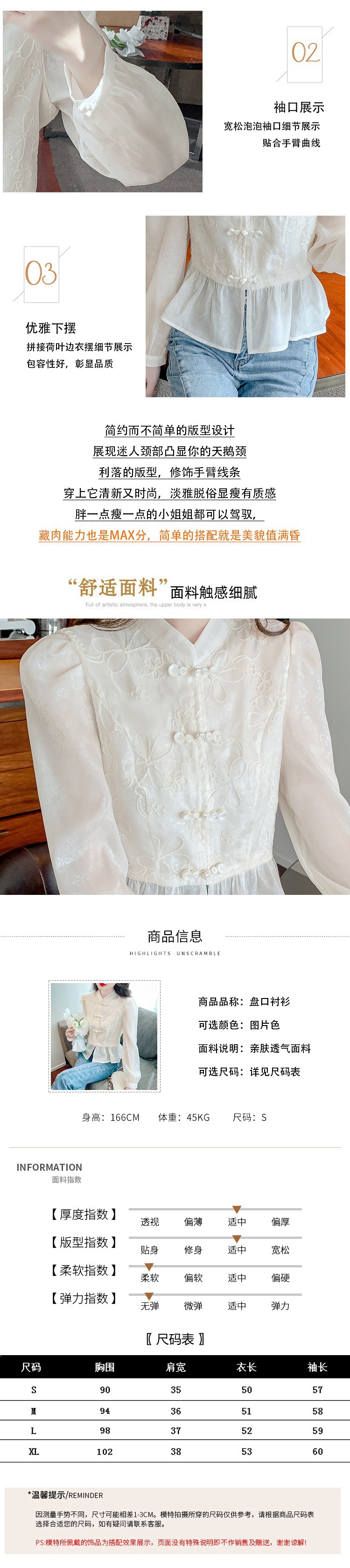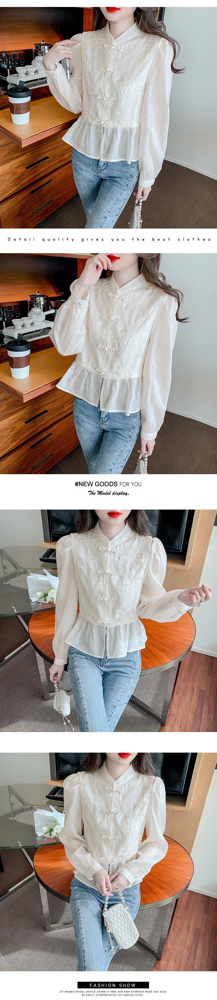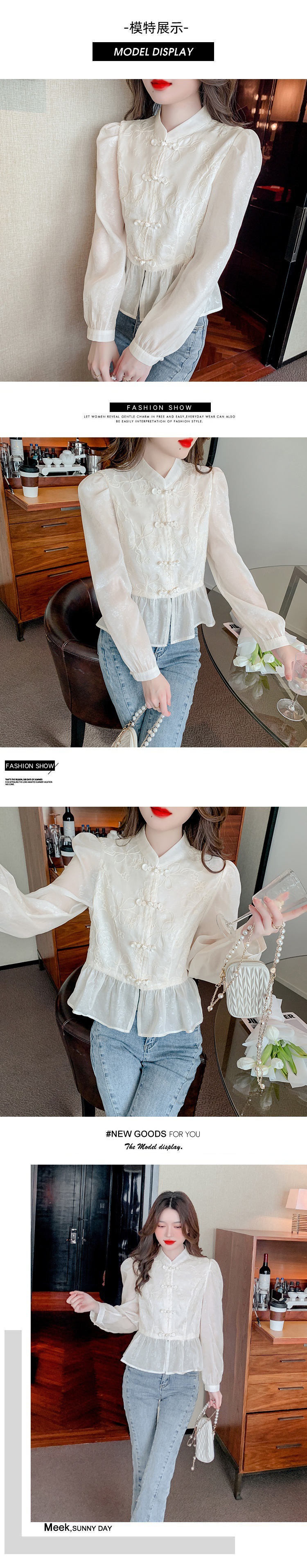리얼 샷 재고 2023 가을 버튼 셔츠 여자의 내셔널 스타일 스탠드 칼라 쉬폰 셔츠 무거운 자수 얇은 세련된 탑스토어 가기