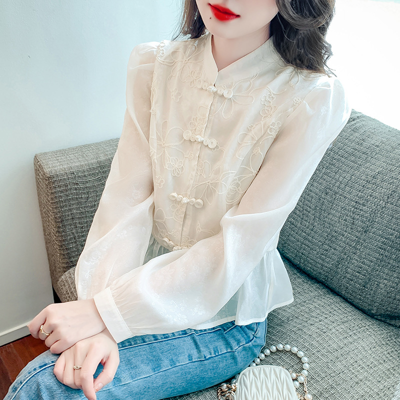 리얼 샷 재고 2023 가을 버튼 셔츠 여자의 내셔널 스타일 스탠드 칼라 쉬폰 셔츠 무거운 자수 얇은 세련된 탑