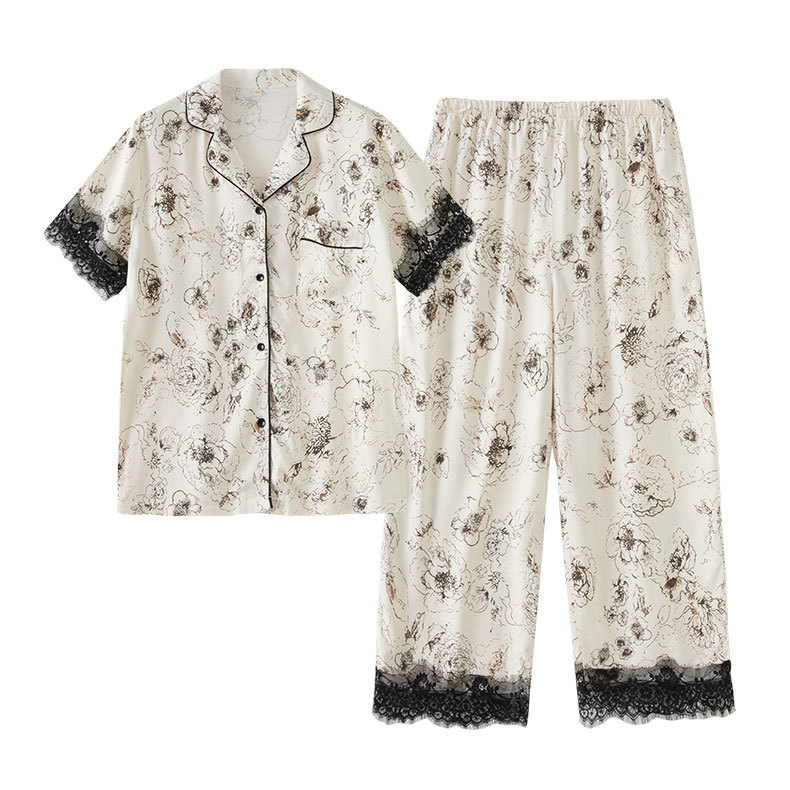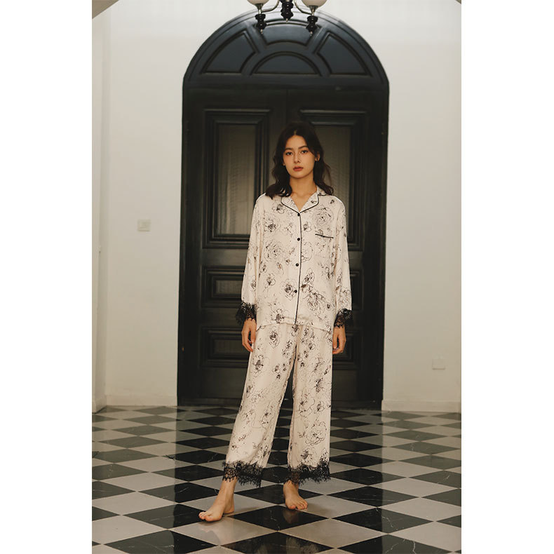 사계절 여성면 새틴 옷깃 홈 옷 레이스 커프 잉크 로즈 긴 소매 파자마 세트