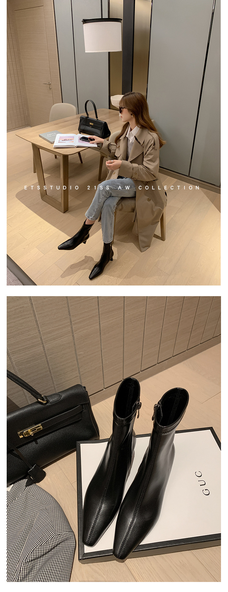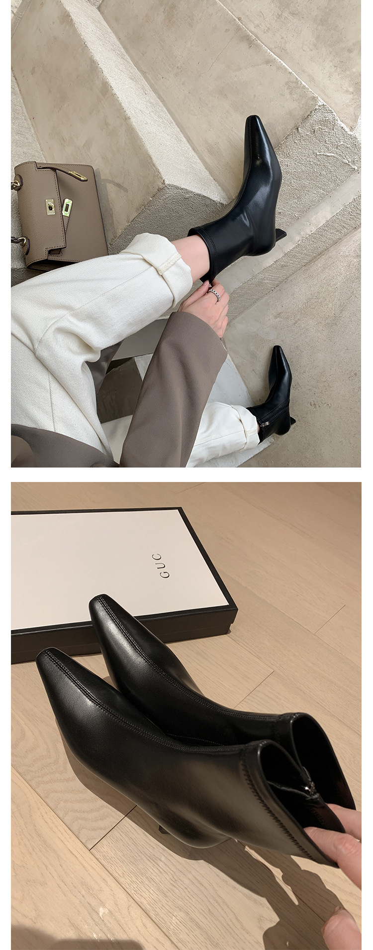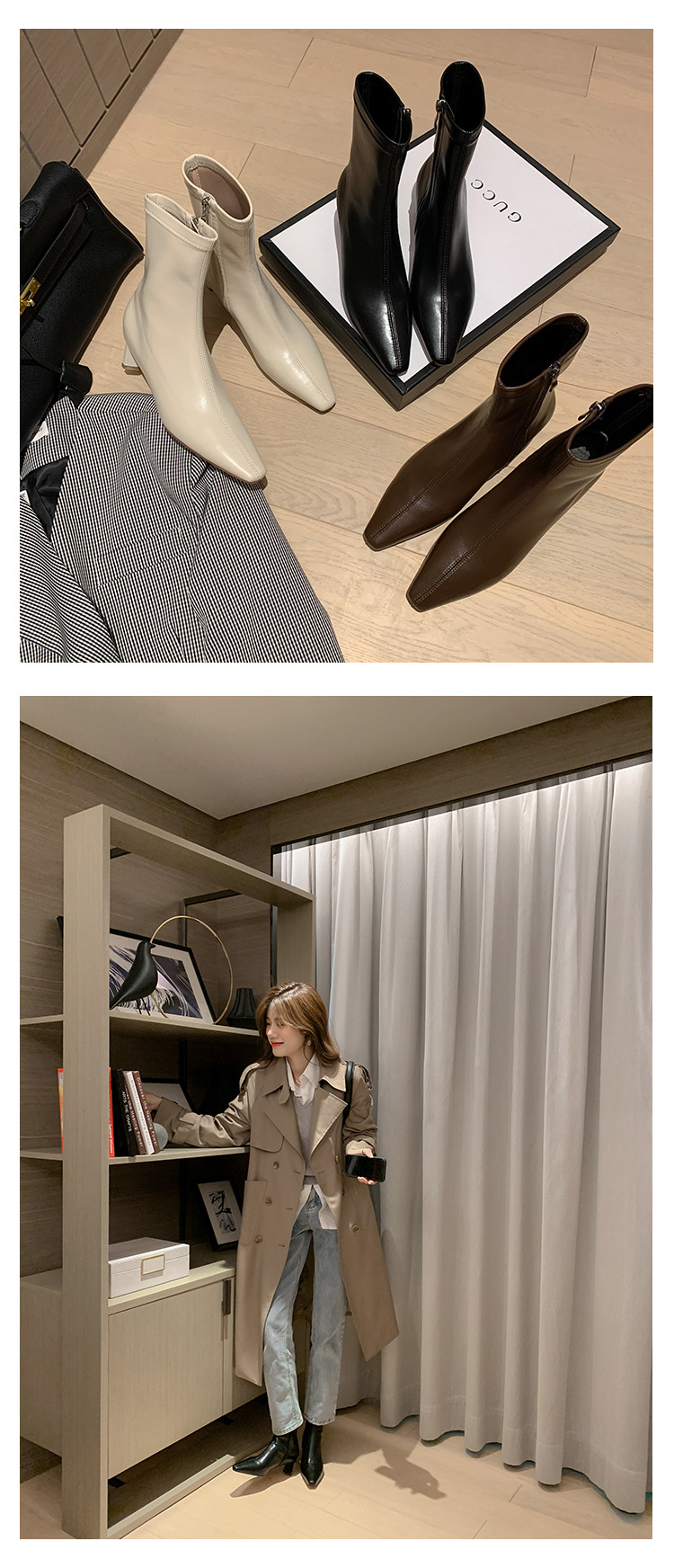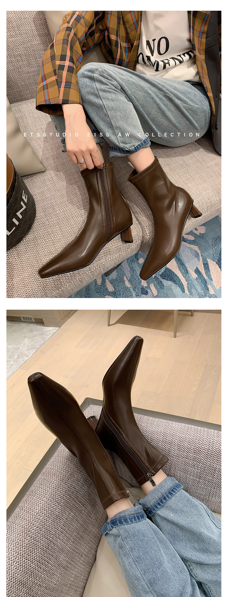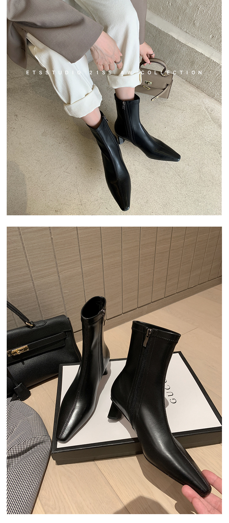 한국 스타일 우아한 마틴 2023 가을과 겨울 새로운 작은 사각 머리 두꺼운 굽 스트레치 얇은 부츠 여성용 모든 매치 하이힐 짧은 부츠스토어 가기