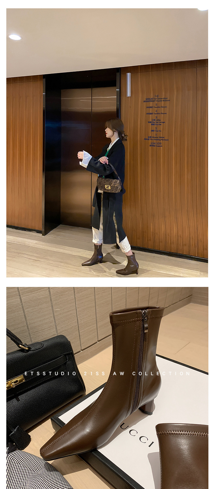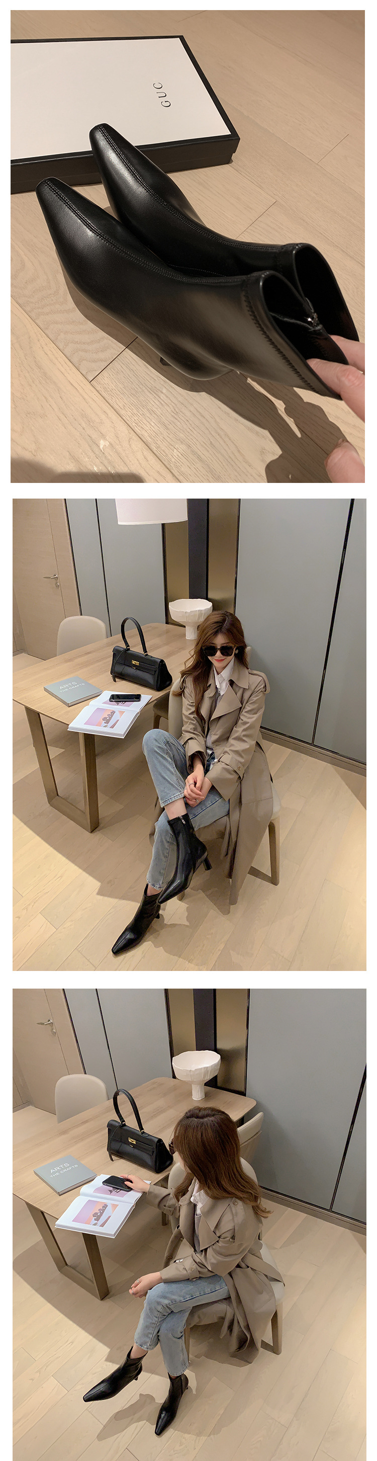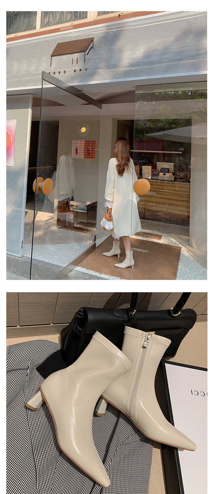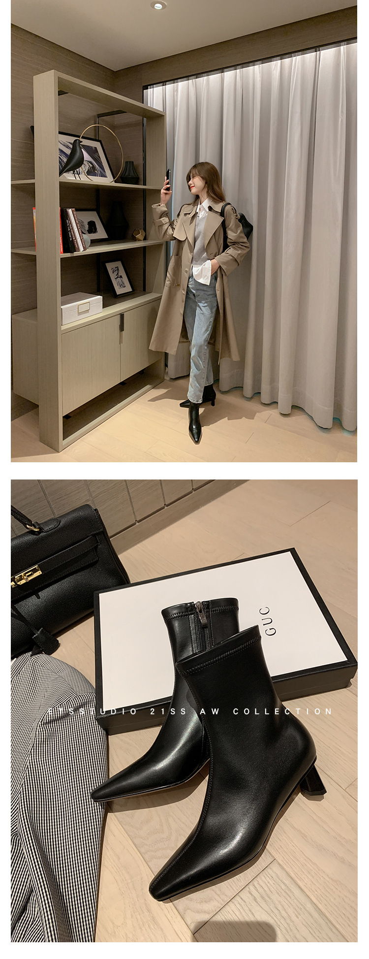 한국 스타일 우아한 마틴 2023 가을과 겨울 새로운 작은 사각 머리 두꺼운 굽 스트레치 얇은 부츠 여성용 모든 매치 하이힐 짧은 부츠스토어 가기