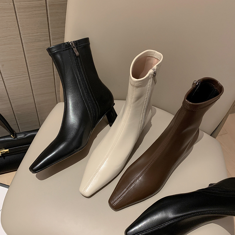 한국 스타일 우아한 마틴 2023 가을과 겨울 새로운 작은 사각 머리 두꺼운 굽 스트레치 얇은 부츠 여성용 모든 매치 하이힐 짧은 부츠