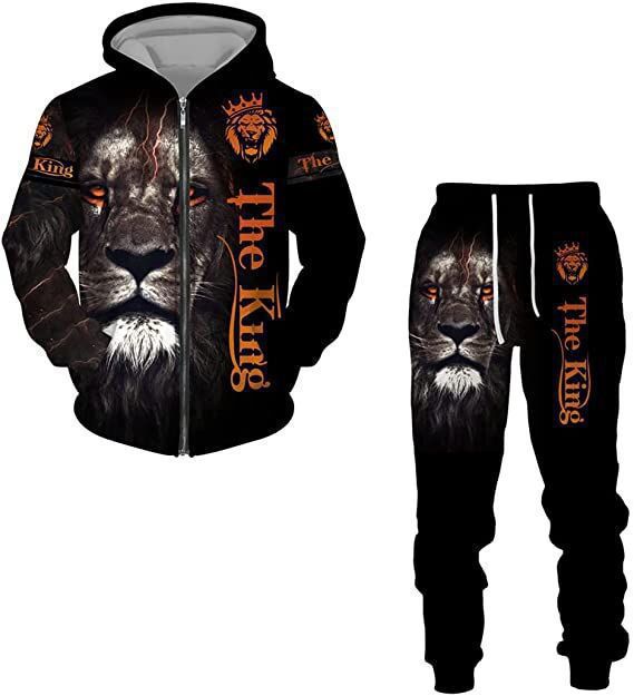 남자의 지퍼 스웨터 세트 3D 인쇄 남자의 스포츠웨어 스포츠웨어 긴 소매 남자의 세트 사자 왕 가을 겨울
