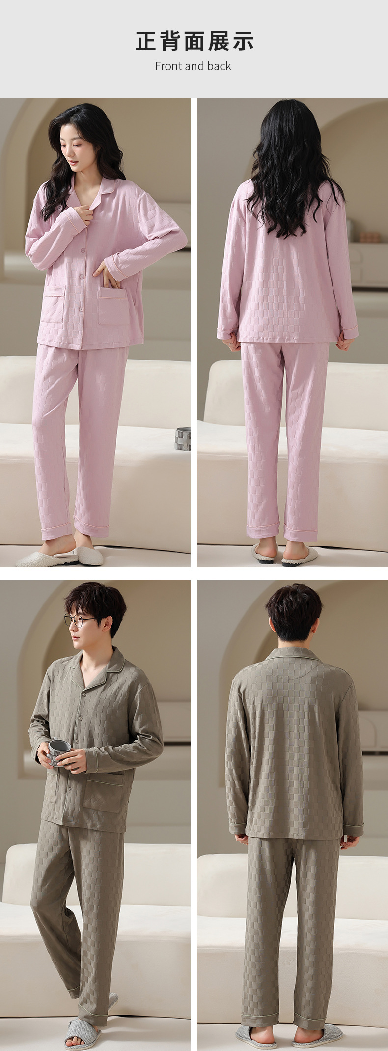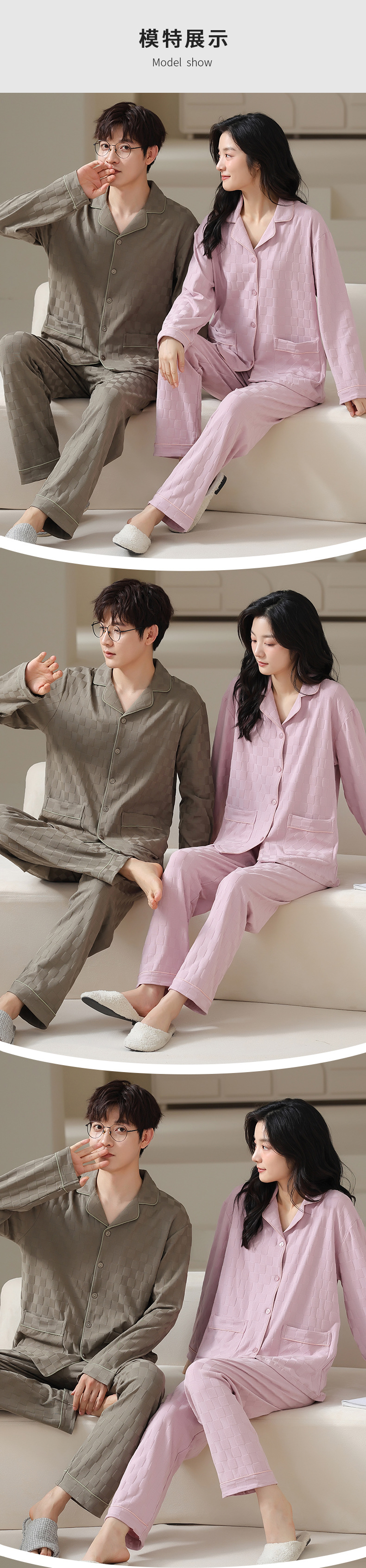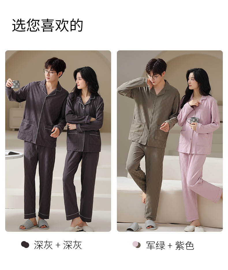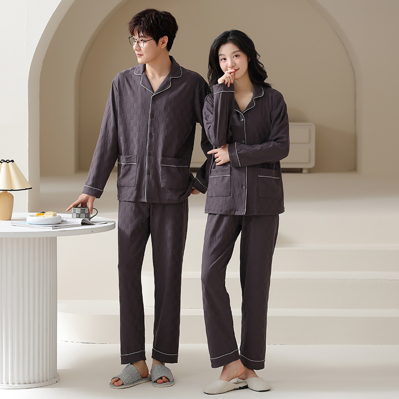 커플 잠옷 여자의 순면 봄과 가을 긴 소매 단색 격자 무늬 자카드 아웃웨어 얇은 가디건 남성 가정복