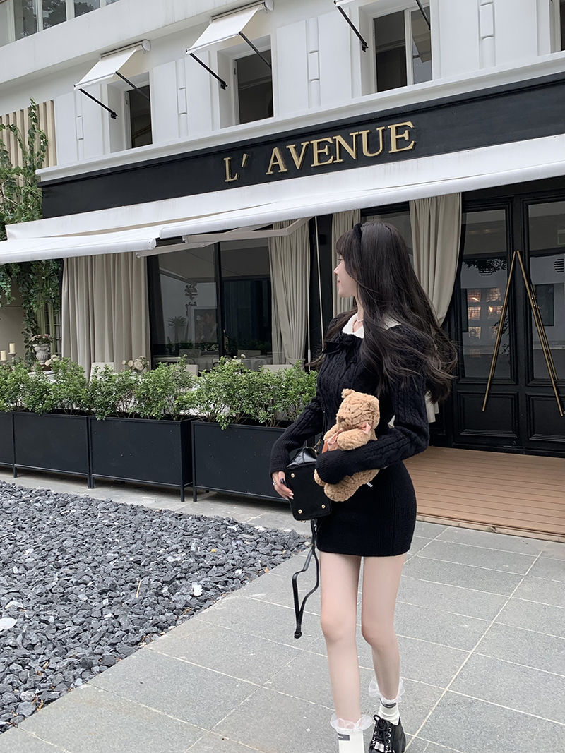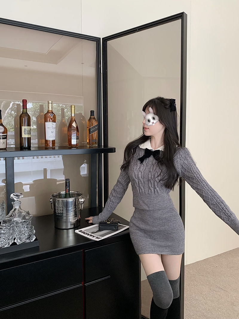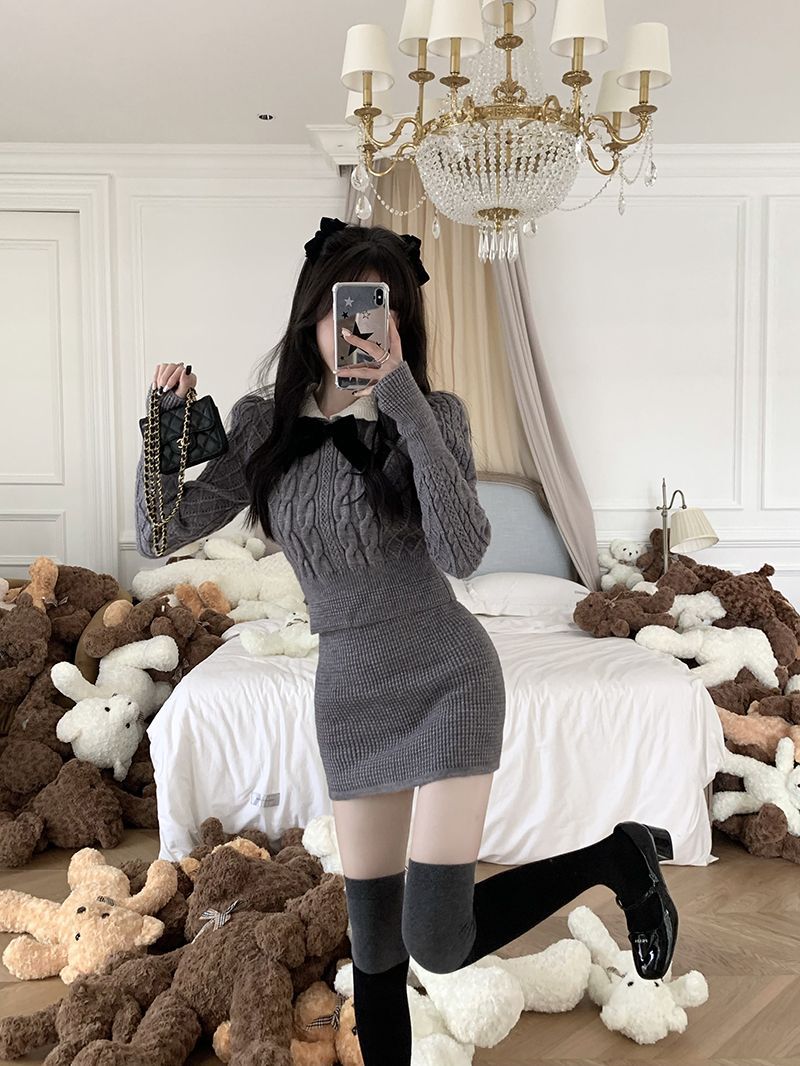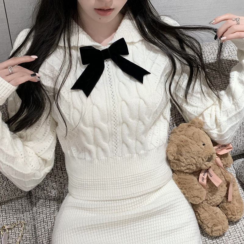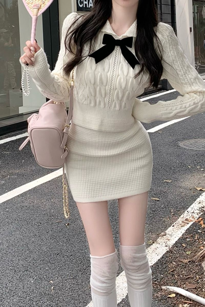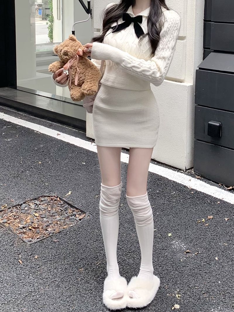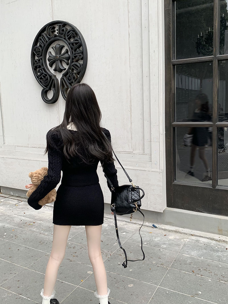 뜨거운 소녀 니트 세트 여자의 우아한 짧은 스웨터 가을과 겨울 엉덩이 스커트 하프 길이 스커트 작은 샤넬 스타일 투피스 유행 세트