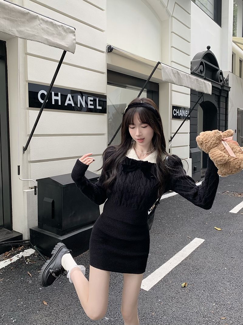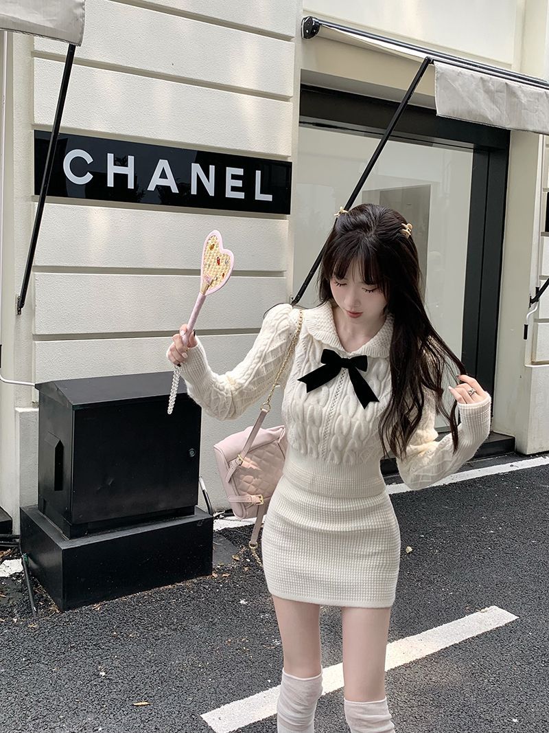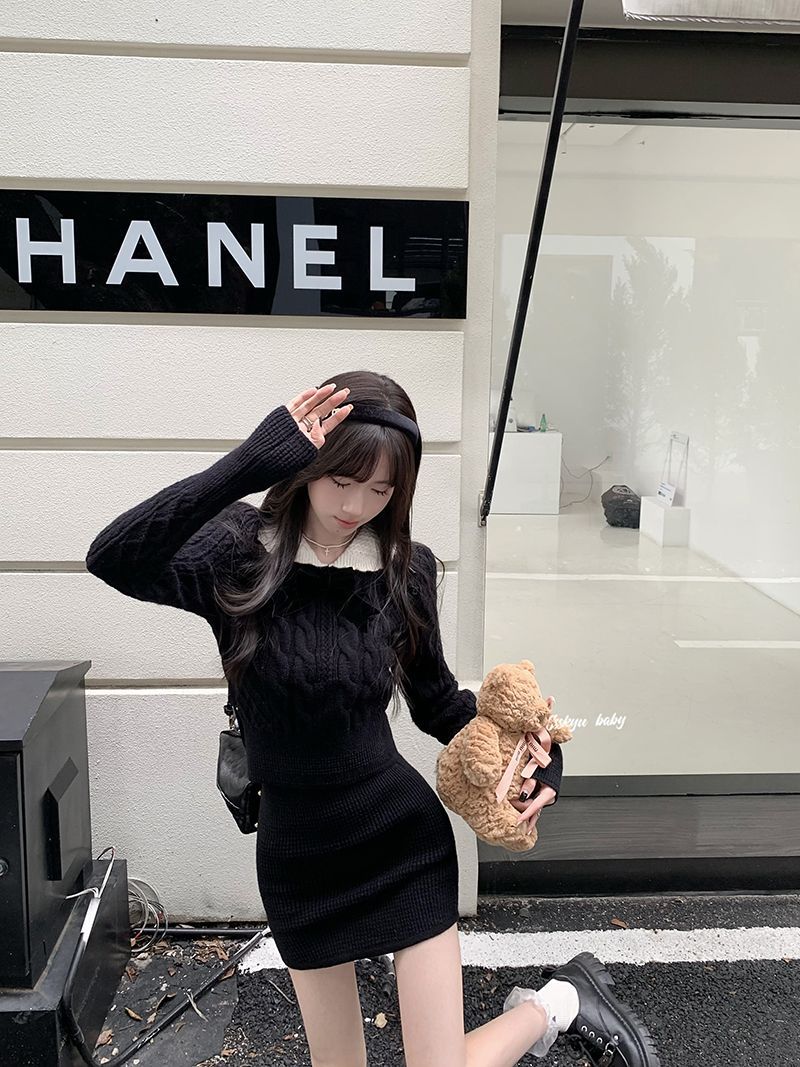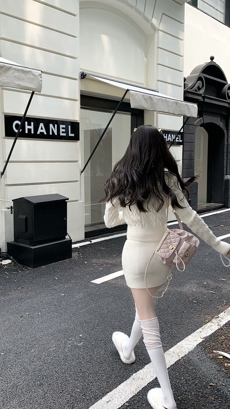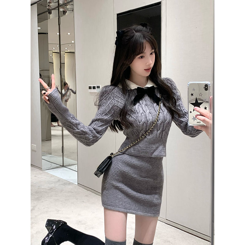 뜨거운 소녀 니트 세트 여자의 우아한 짧은 스웨터 가을과 겨울 엉덩이 스커트 하프 길이 스커트 작은 샤넬 스타일 투피스 유행 세트스토어 가기