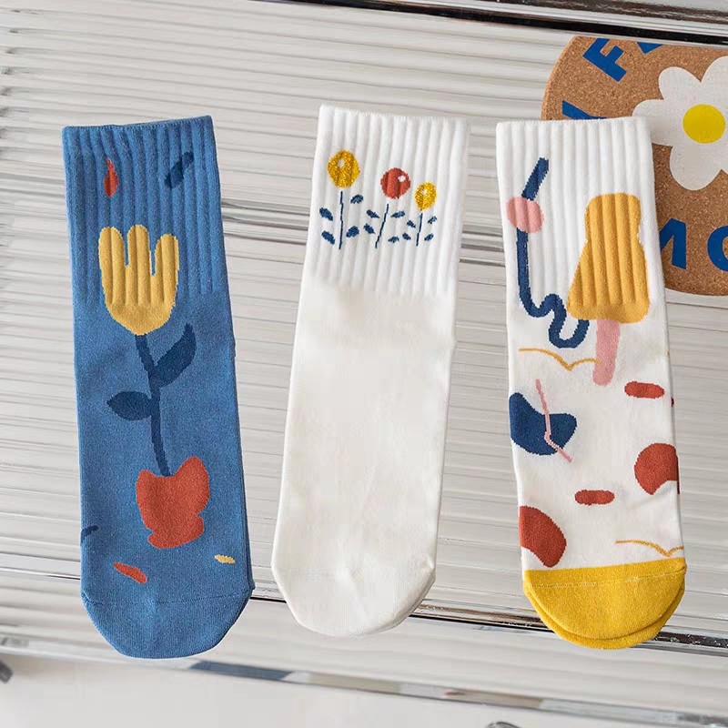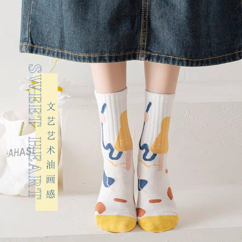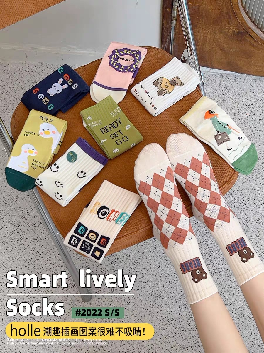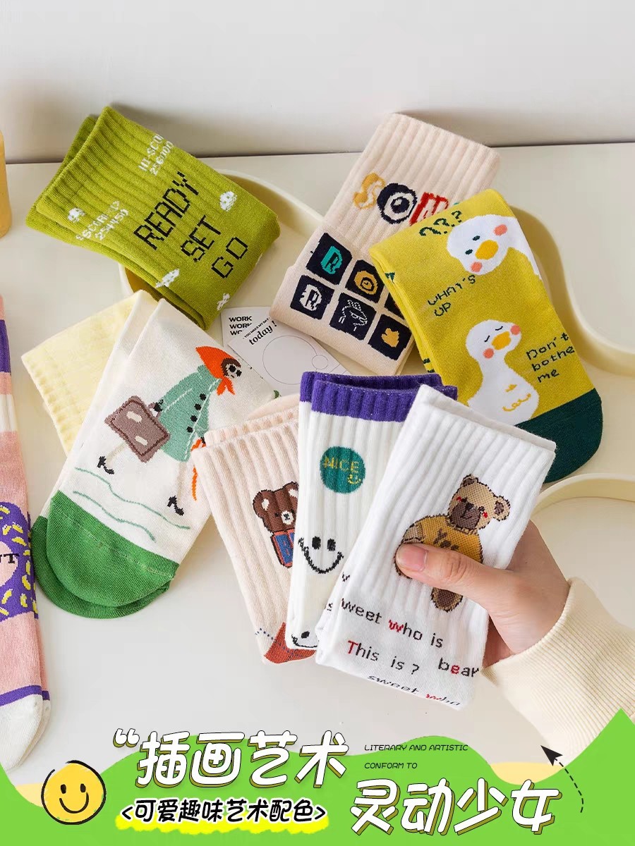 Zhuji 양말 여성용 중간 길이 양말 귀여운 일본 만화 일러스트 여름 얇은 면 양말 봄과 가을 유행 겉옷 스타킹