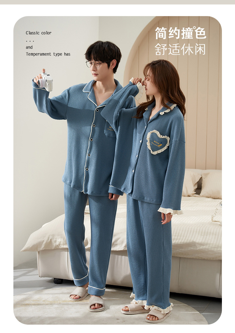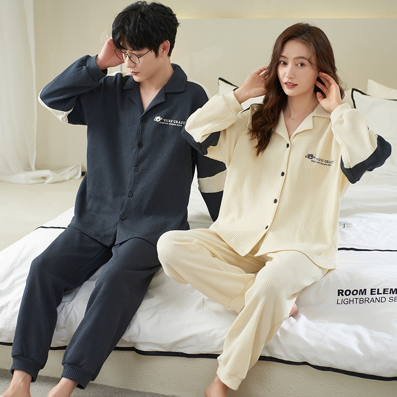 2023 새로운 가을 커플 잠옷 여자의 긴 소매 바지 와플렛 카디건 남자의 가을과 겨울 가정 의류 세트