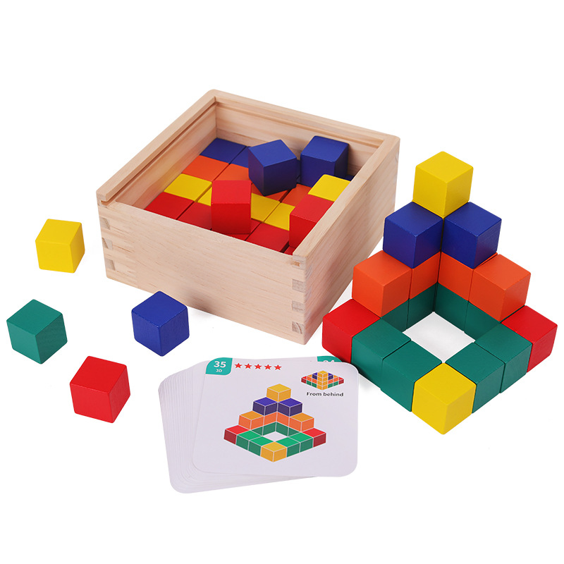 50粒木盒正方体实木积木小孩逻辑思维卡片套装教具趣味闯关玩具