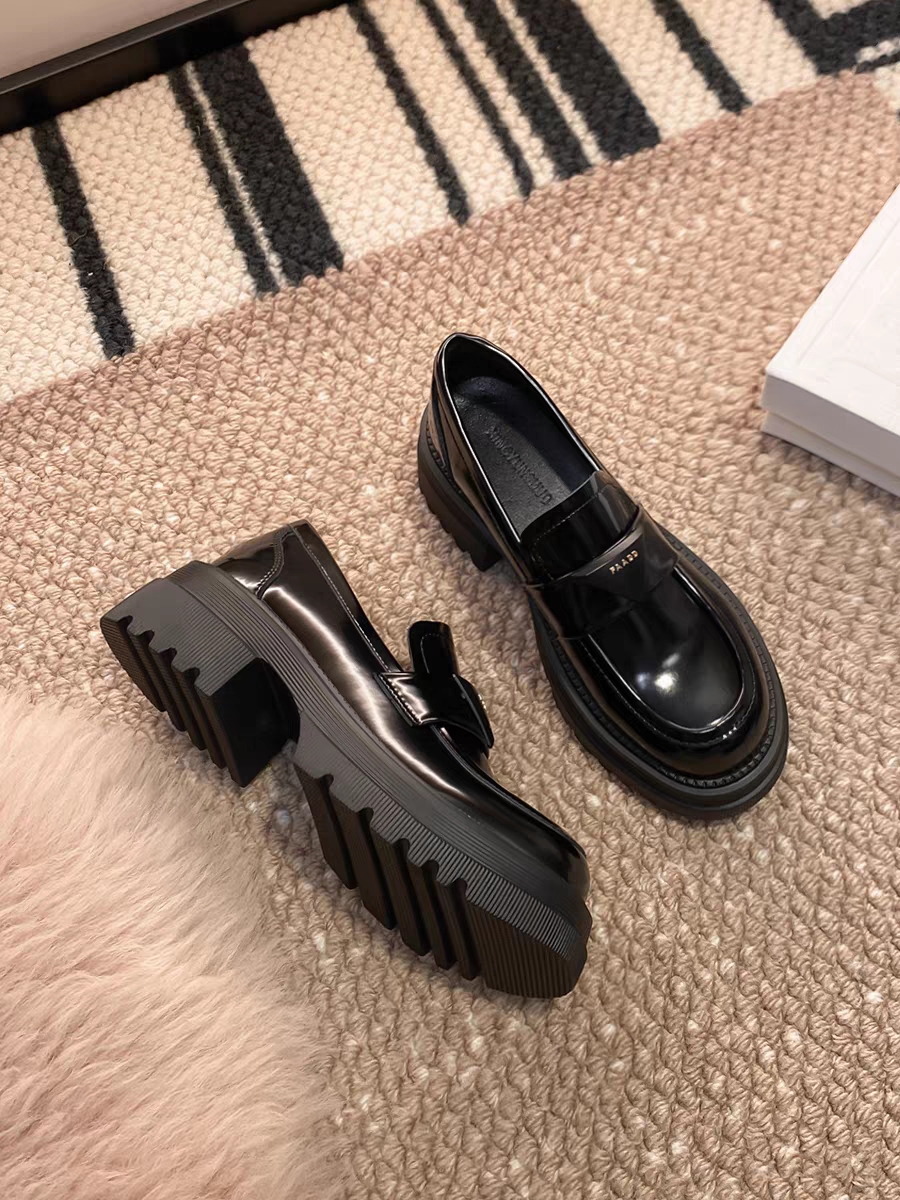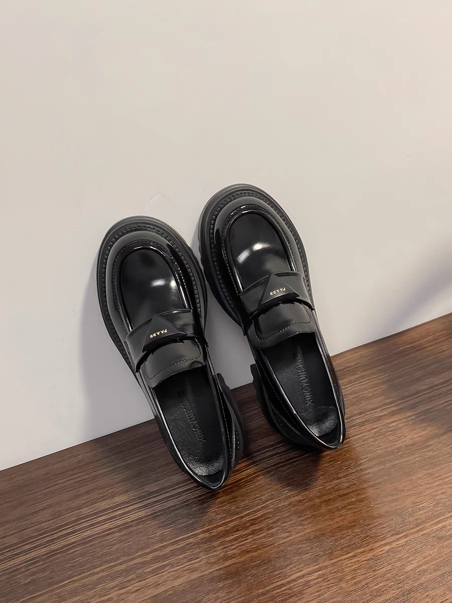 두꺼운 밑창 로퍼 여성용 영국 스타일 가죽 신발 삼각 로고 2024년 신상 키높이 천연 가죽 두꺼운 굽 검정색 단화스토어 가기