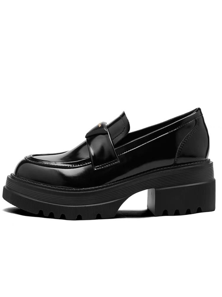 두꺼운 밑창 로퍼 여성용 영국 스타일 가죽 신발 삼각 로고 2024년 신상 키높이 천연 가죽 두꺼운 굽 검정색 단화