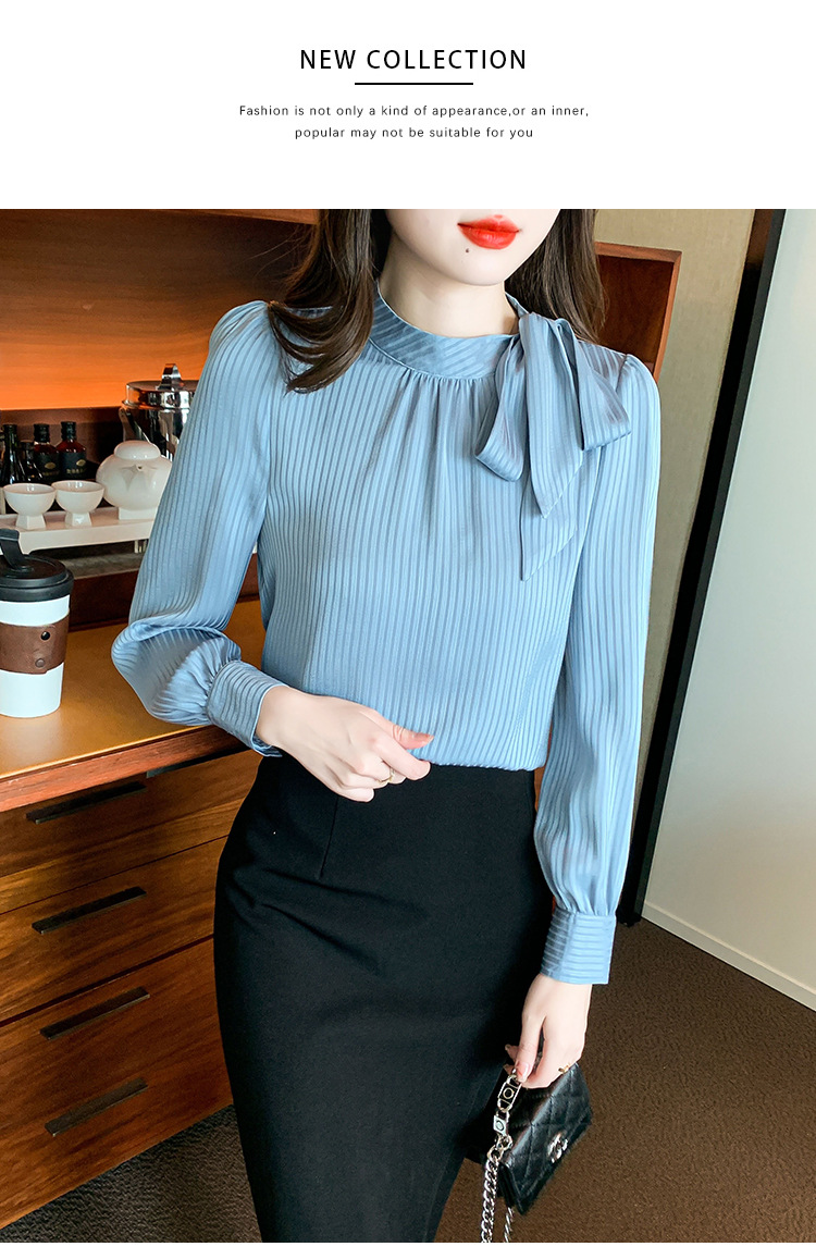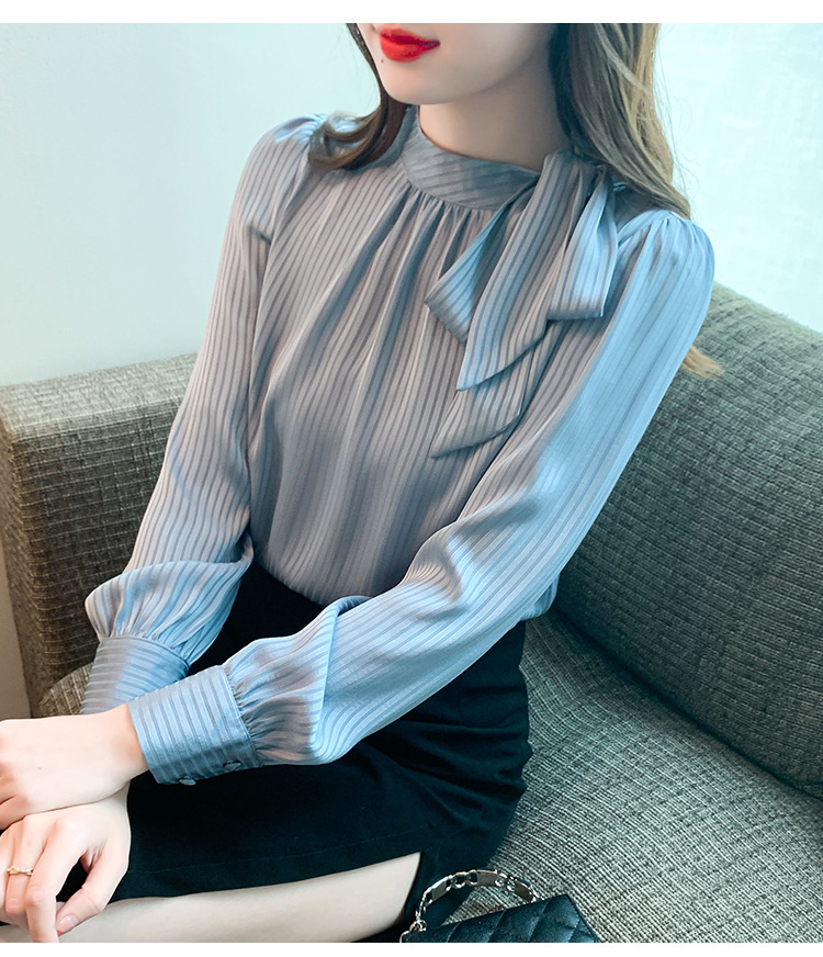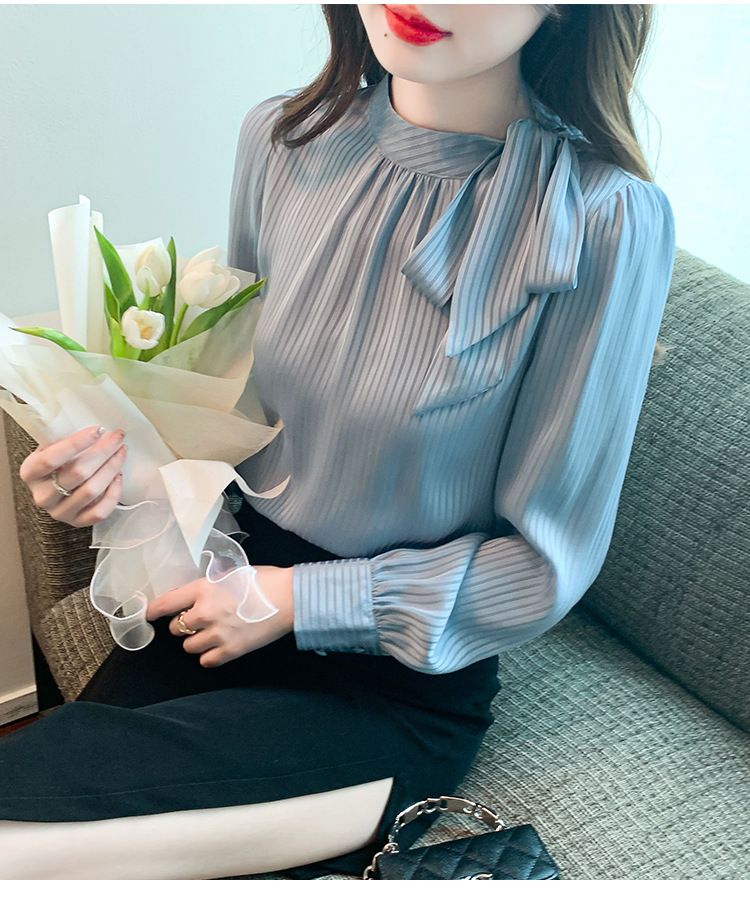 실제 촬영된 쉬폰 셔츠 여성용 고급스러운 2026 봄 신상 한국 스타일 리본 긴팔 우아한 스트라이프 탑