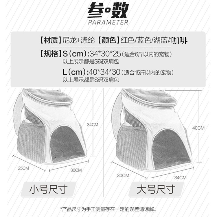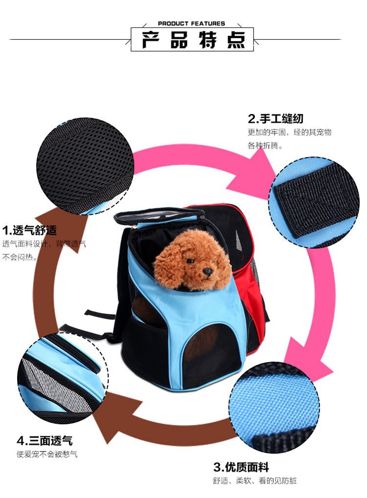 品名宠物双肩包材料65D牛津布颜色红、黑、蓝、咖啡尺寸小号:30*24*33cm,重量340g