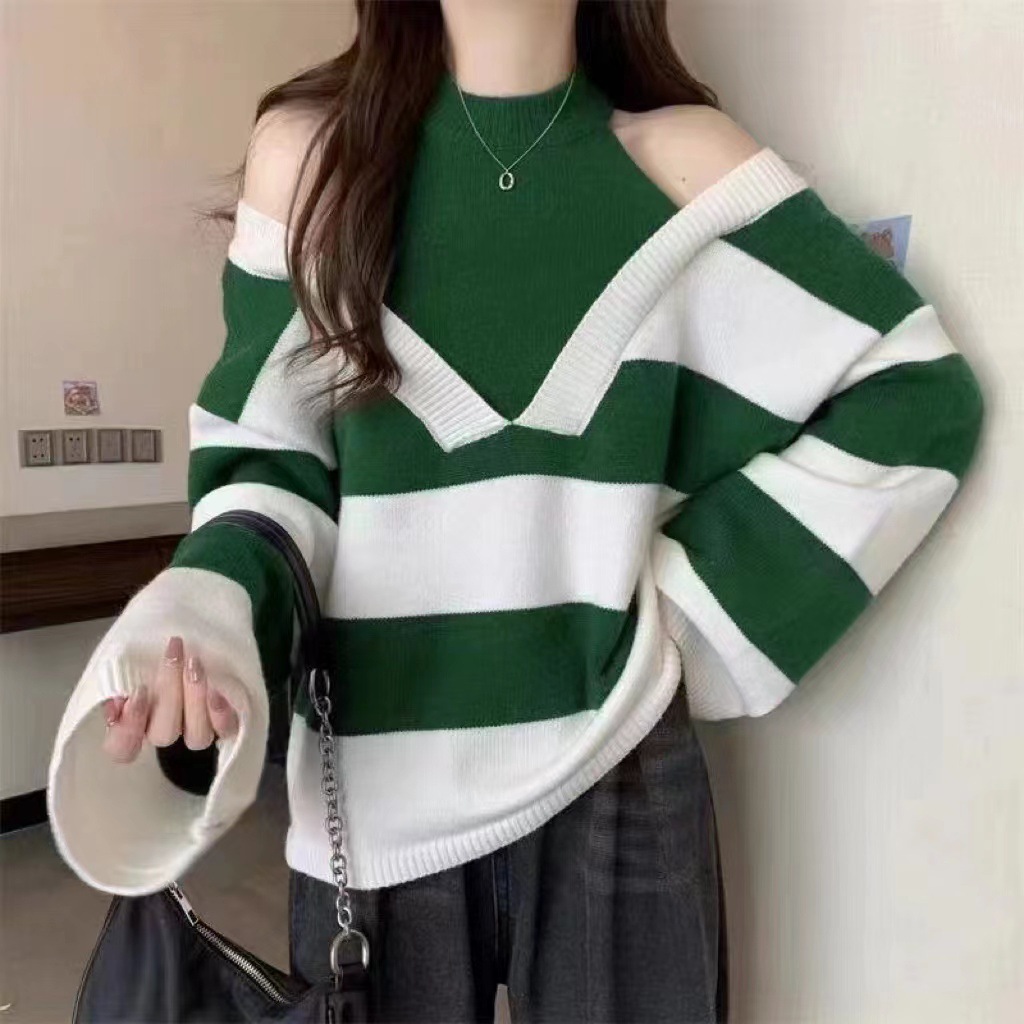 가짜 투피스 행잉 넥 오프 숄더 느슨한 스트라이프 니트 여성용 게으른 스타일 가을과 겨울 새로운 세련된 풀오버 모든 매치 스웨터스토어 가기