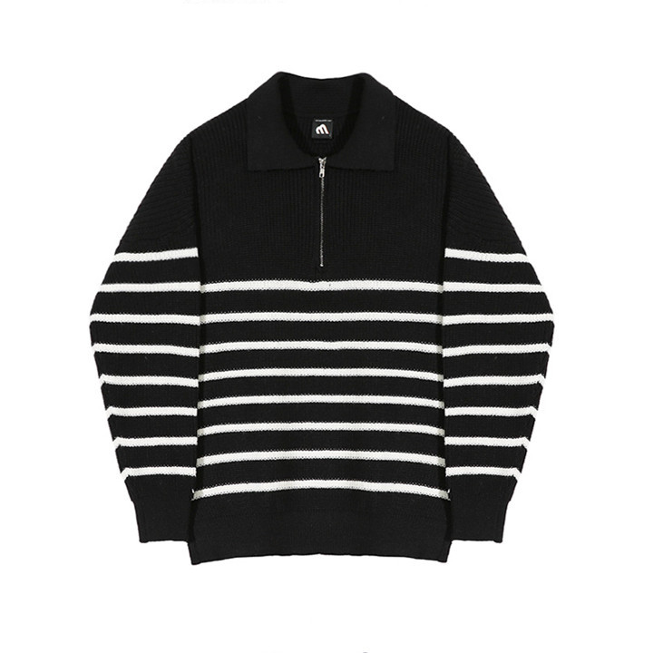 옷깃 긴 소매 스웨터 남자의 가을 한국 스타일 느슨한 복고풍 캐주얼 하프 지퍼 폴로 스트라이프 스웨터 최신 유행