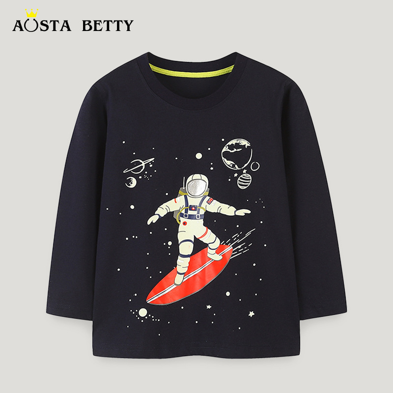 유럽과 미국의 면화 어린이 긴팔 티셔츠 가을 새로운 유행 우주 비행사 행성 인쇄 소년의 빛나는 탑