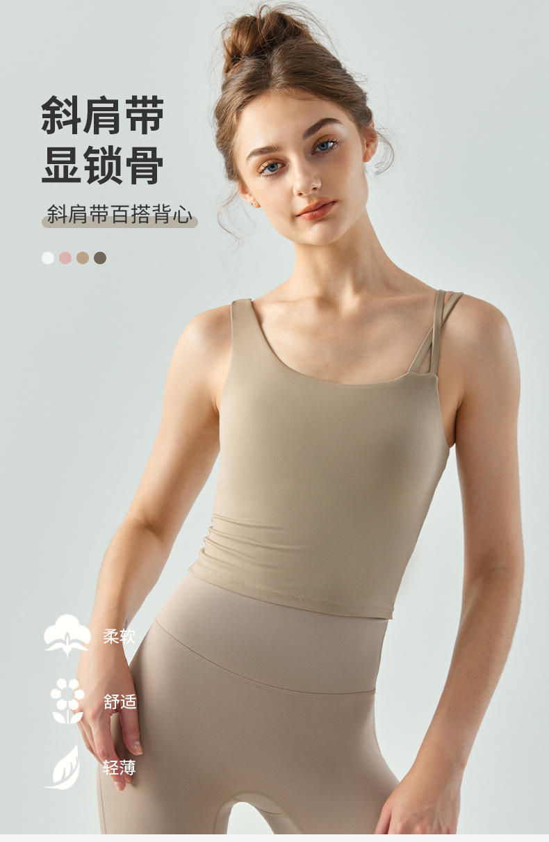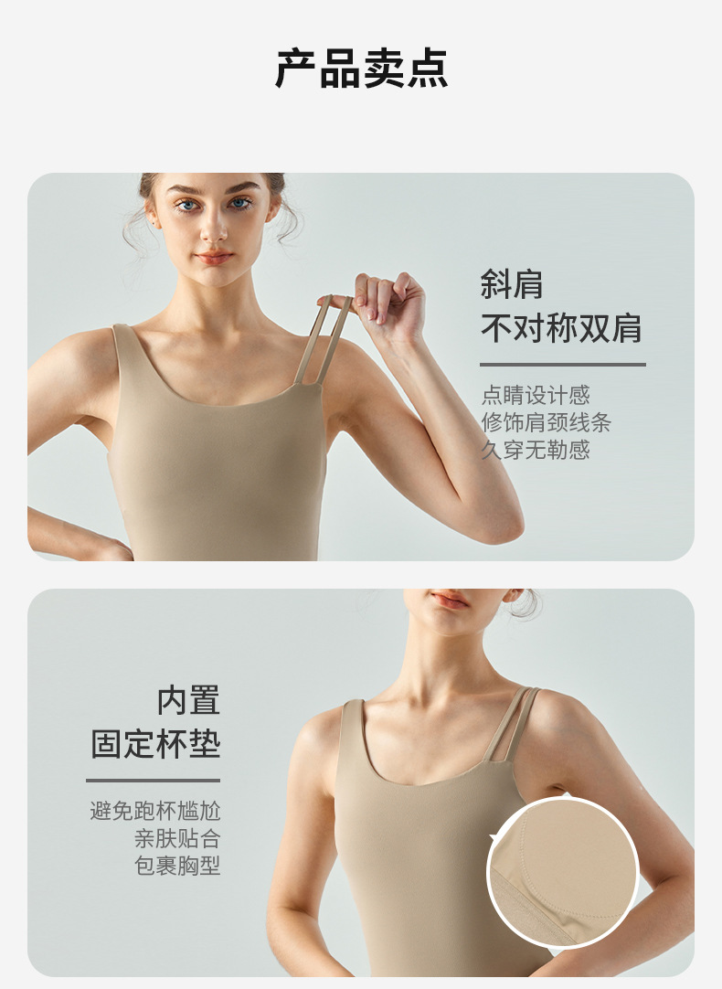 여성을 위한 새로운 라운드 넥 심리스 올인원 슬링 스포츠 탑, 틈새 디자인, 가슴 패드가 있는 슬림핏 요가 조끼