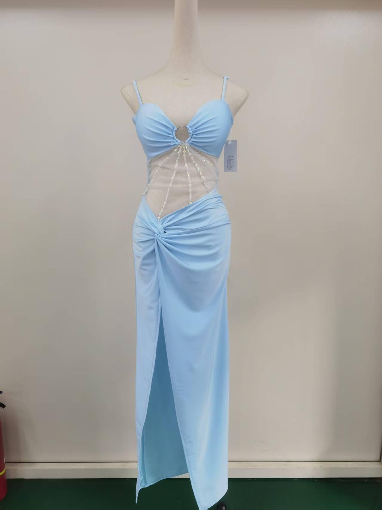 화이트 슬링 메쉬 스플 라이스 롱 스커트 나이트 클럽 섹시 드레스 로우 컷 백리스 슬릿 슬림 이브닝 드레스 여성용