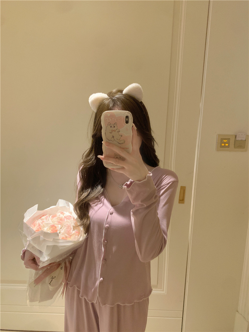 잠옷 여자의 봄 여름 가을 모달 면 섹시 편안한 V-넥 긴 소매 바지 세트 가정 의류스토어 가기