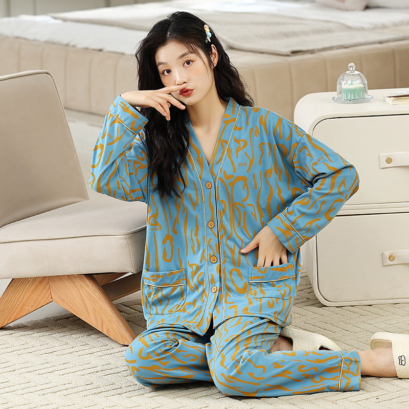 TikTok 라이브 잠옷 여자의 봄과 가을 카디건 달콤한 캐주얼 긴 소매 바지 세트 일본의 새로운 플러스 사이즈 세트