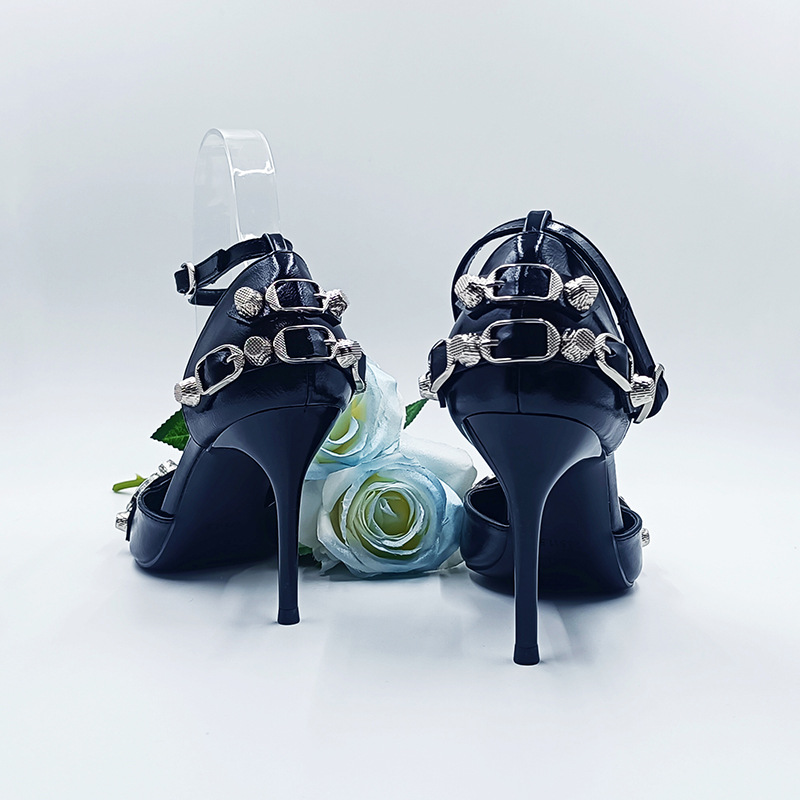 2023 새로운 유럽 및 미국 렌즈 스터드 하이힐 중공 여성 신발 펑크 스타일 스틸레토 힐 벨트 버클 신발스토어 가기