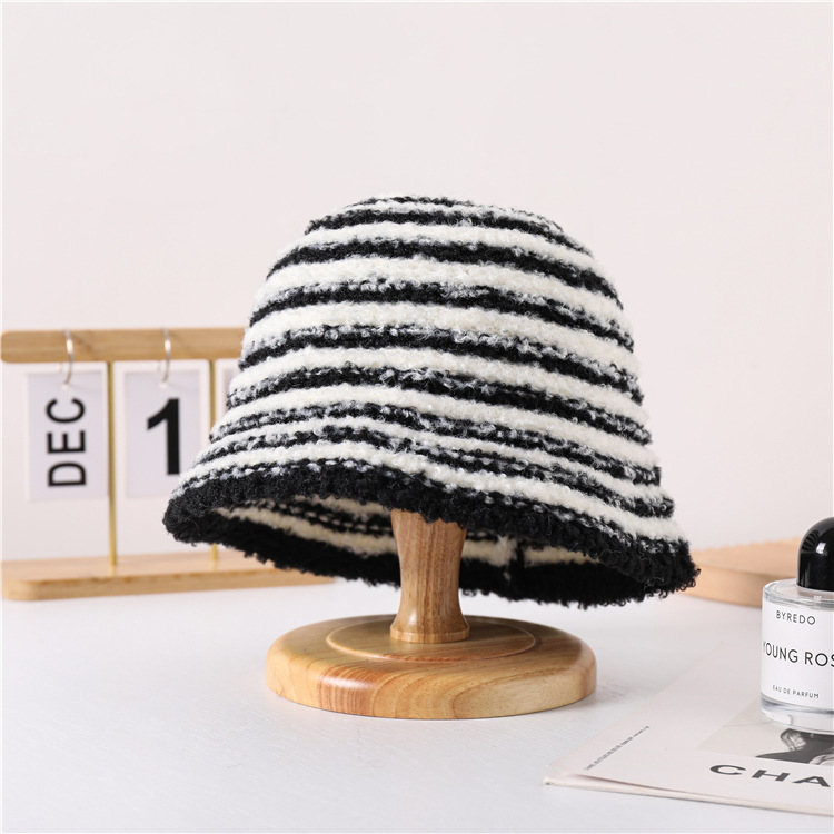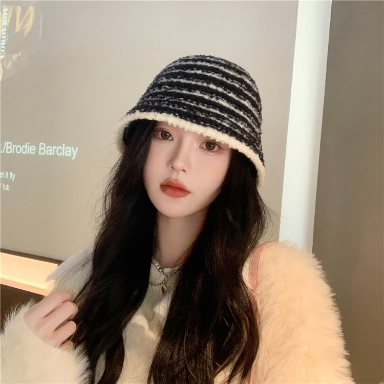 인터넷으로 유명한 스트라이프 양가죽 어부 모자 여성용 한국식 봉제 버킷 모자 여성용 가을과 겨울 일반 얼굴 덮음 큰 머리 분지 모자