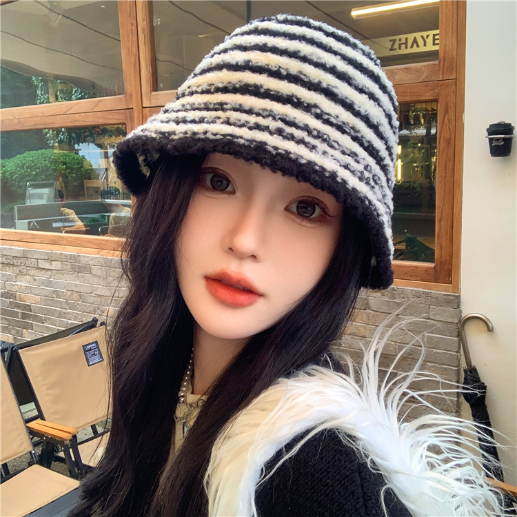 인터넷으로 유명한 스트라이프 양가죽 어부 모자 여성용 한국식 봉제 버킷 모자 여성용 가을과 겨울 일반 얼굴 덮음 큰 머리 분지 모자스토어 가기