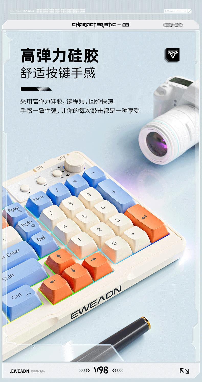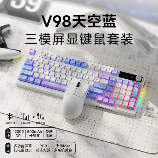 • V98 하늘색 3모드 화면 디스플레이 키보드[전원 디스플레이 + RGB 조명 효과] + X23SE 3모드 마우스