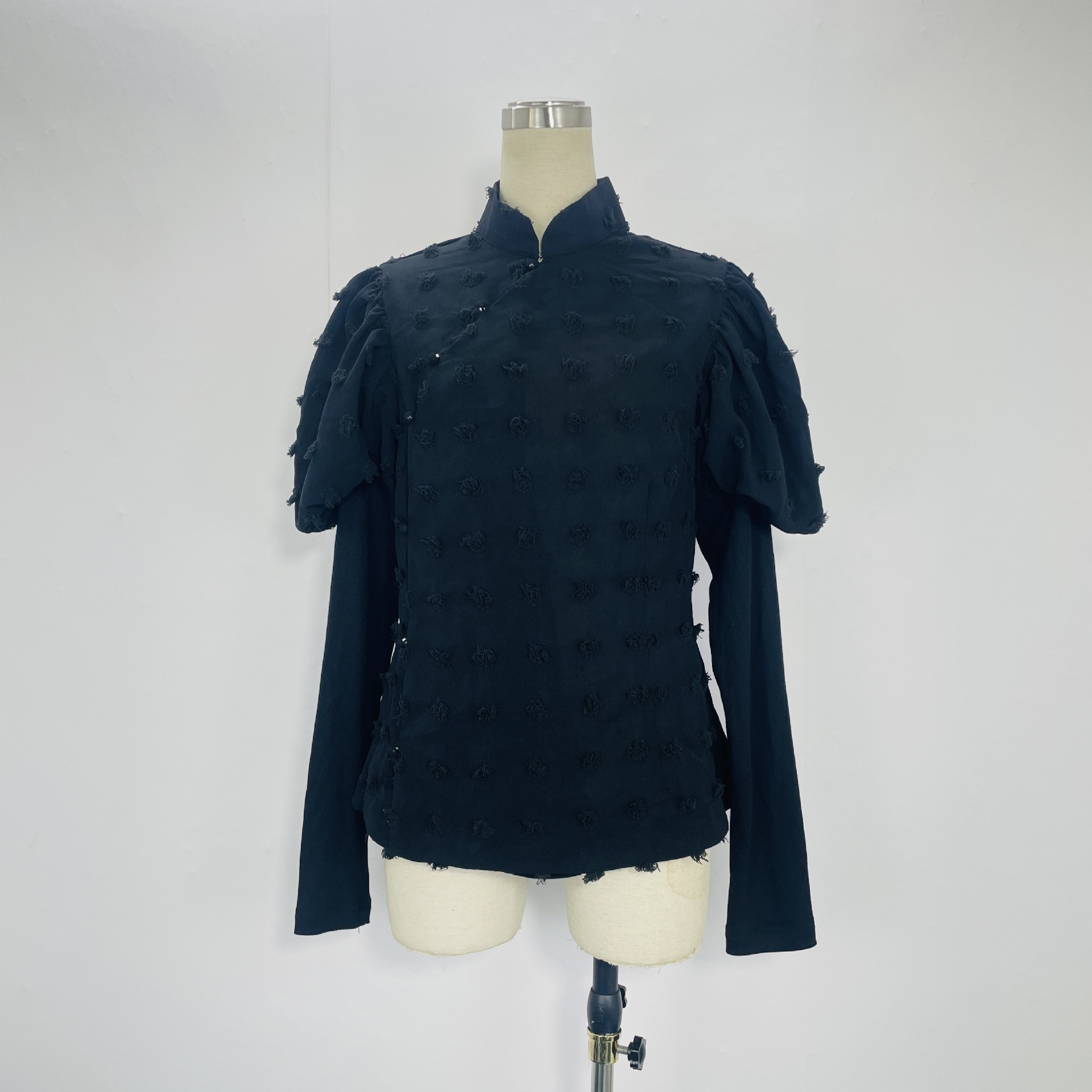 Zhou 또한 Shu Qi 블랙 새로운 중국 버블 슬리브 버튼 셔츠 여성용 자카드 가짜 투피스 내셔널 스타일 슬림 핏 탑