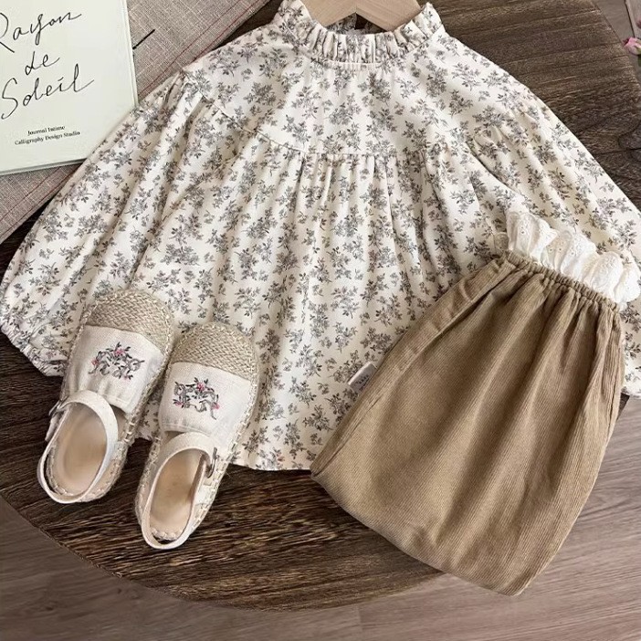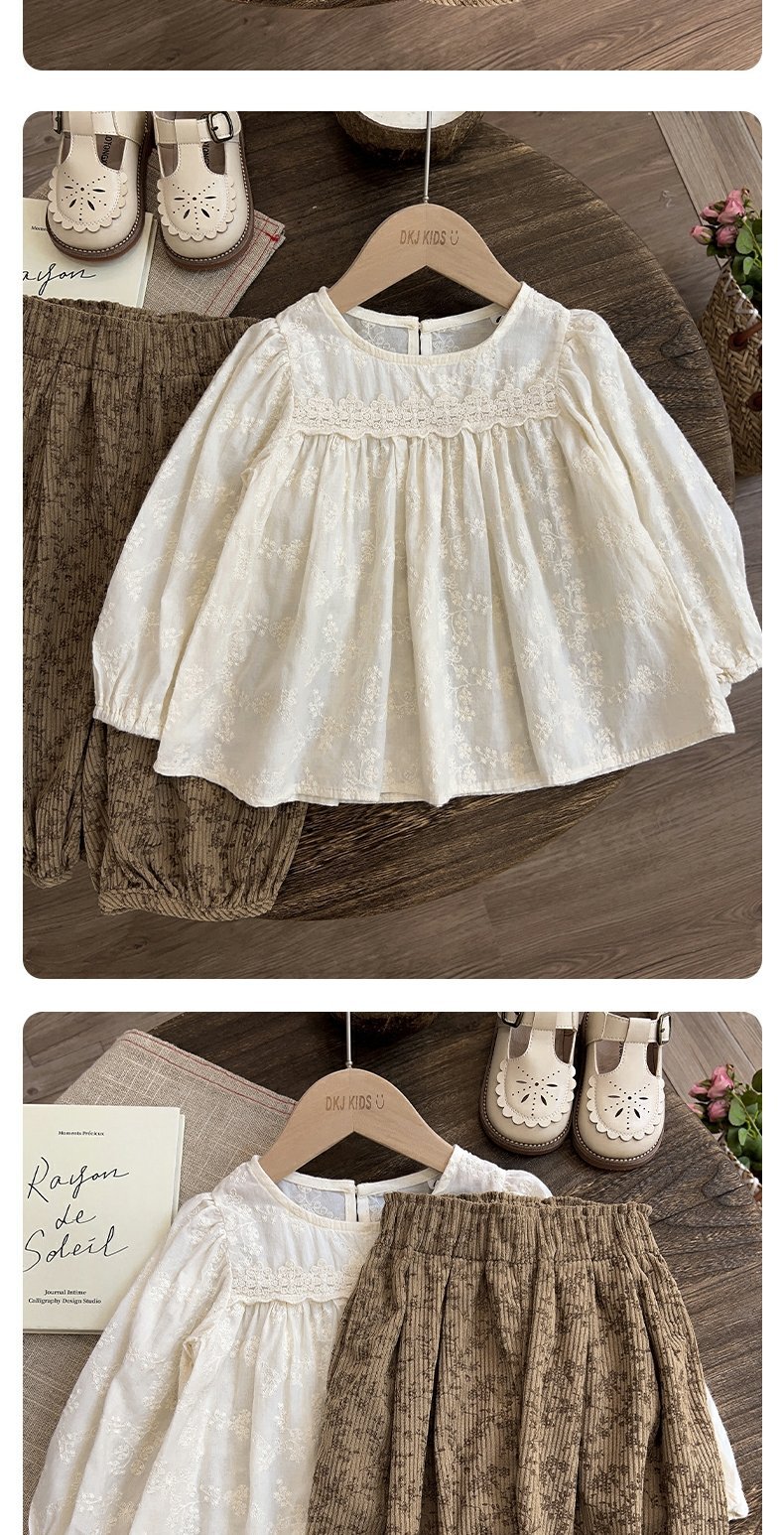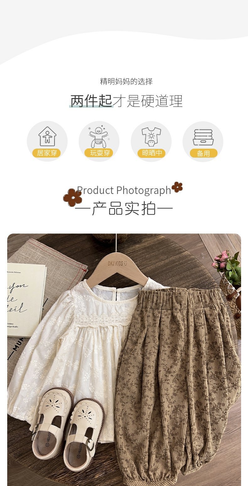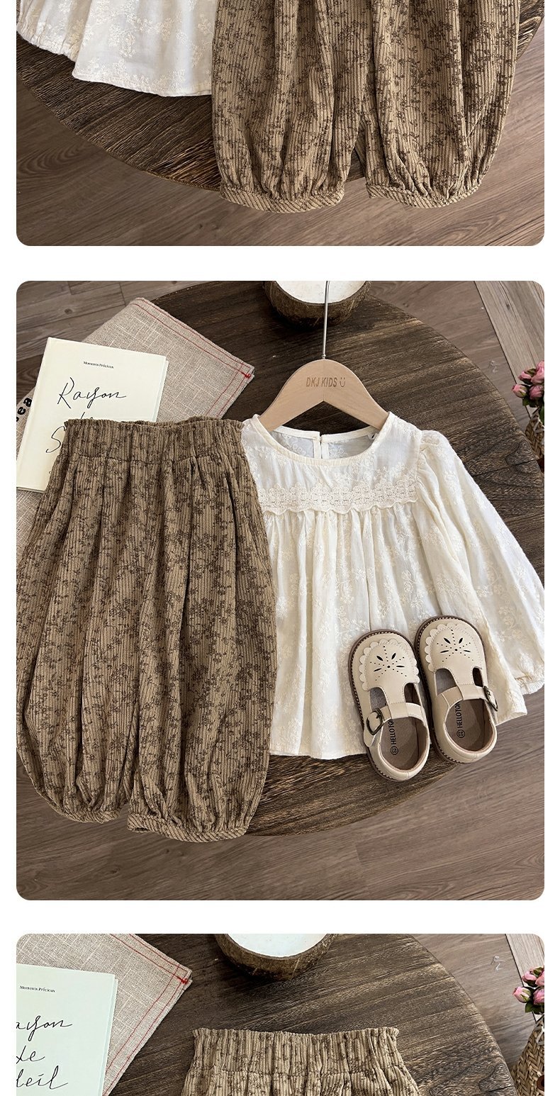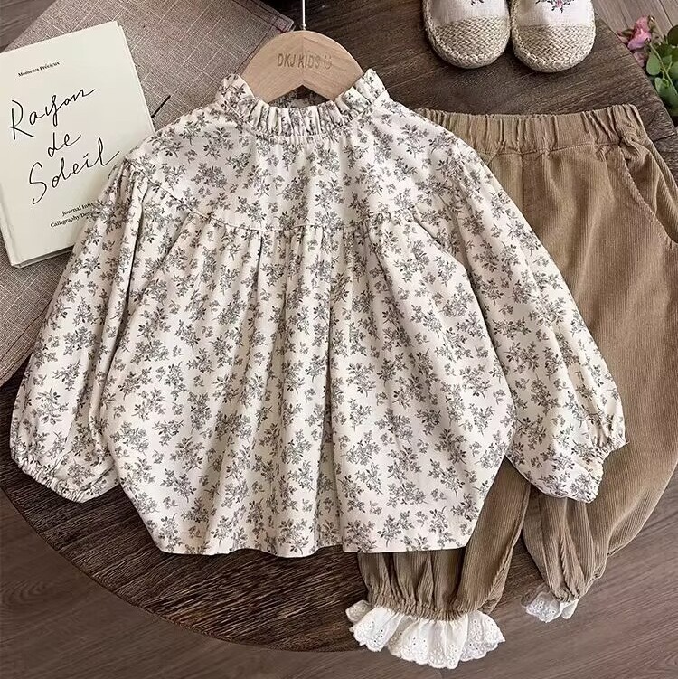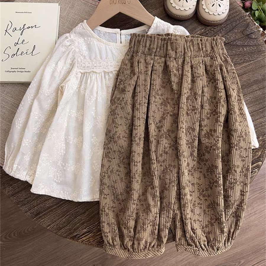 어린 연예인들을 위한 고급 모델! 2025년 가을 신상 여아 자카드 자수 레이스 셔츠와 플로럴 팬츠 세트