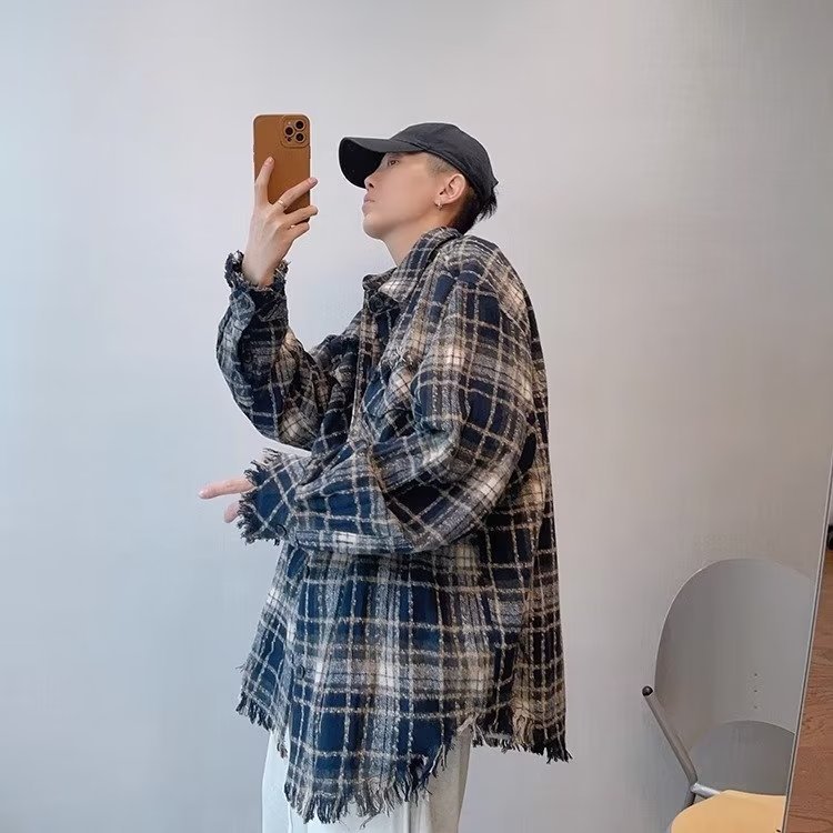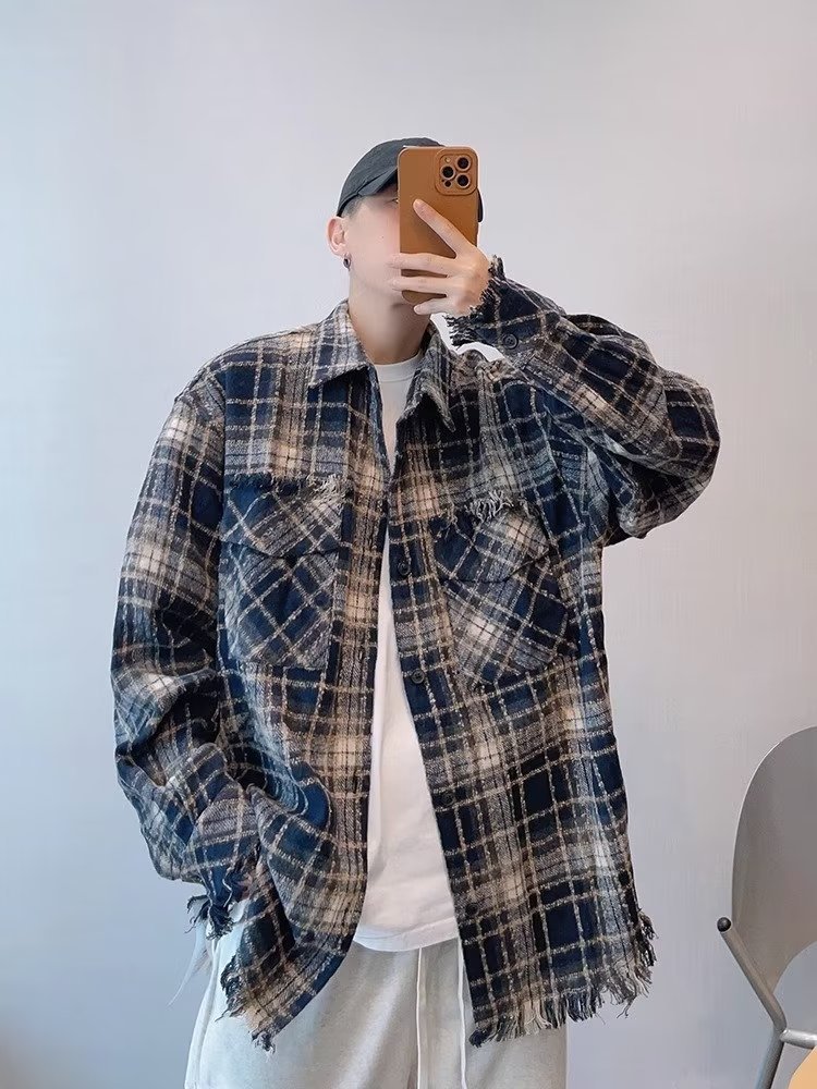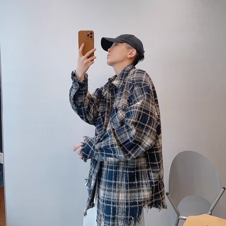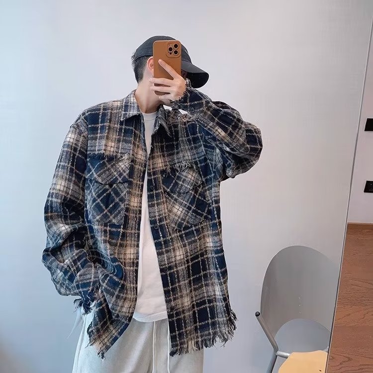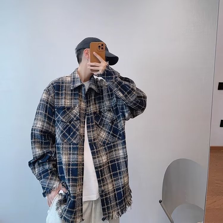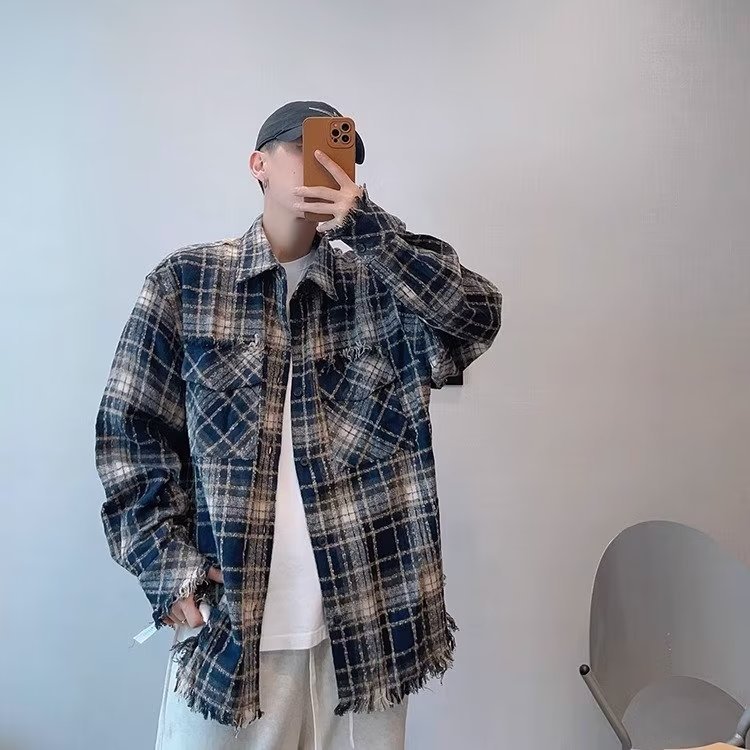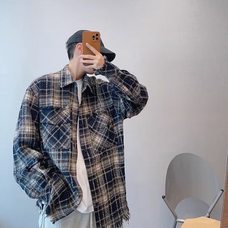 가을 2024 새로운 미국 빈티지 격자 무늬 옷깃 재킷 남자의 플러스 사이즈 포켓 샤넬 스타일 술 셔츠 재킷스토어 가기