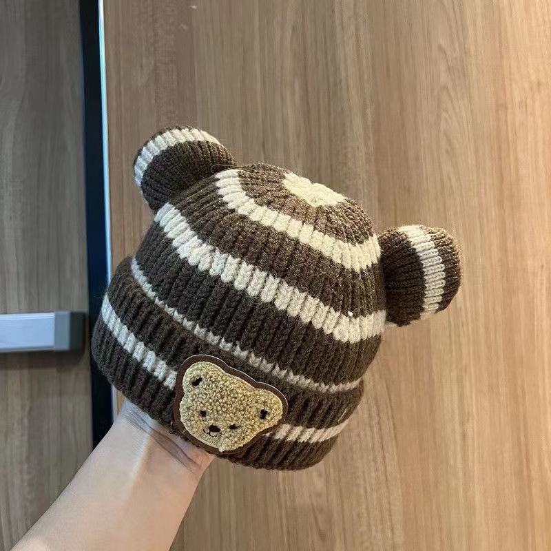 가을과 겨울 어린이 따뜻한 모자 귀여운 줄무늬 곰 모자 한국 아기 더블 볼 니트 모자 남성 및 여성 보물 모자