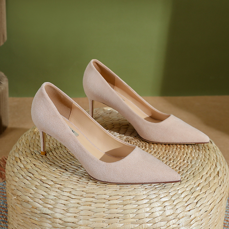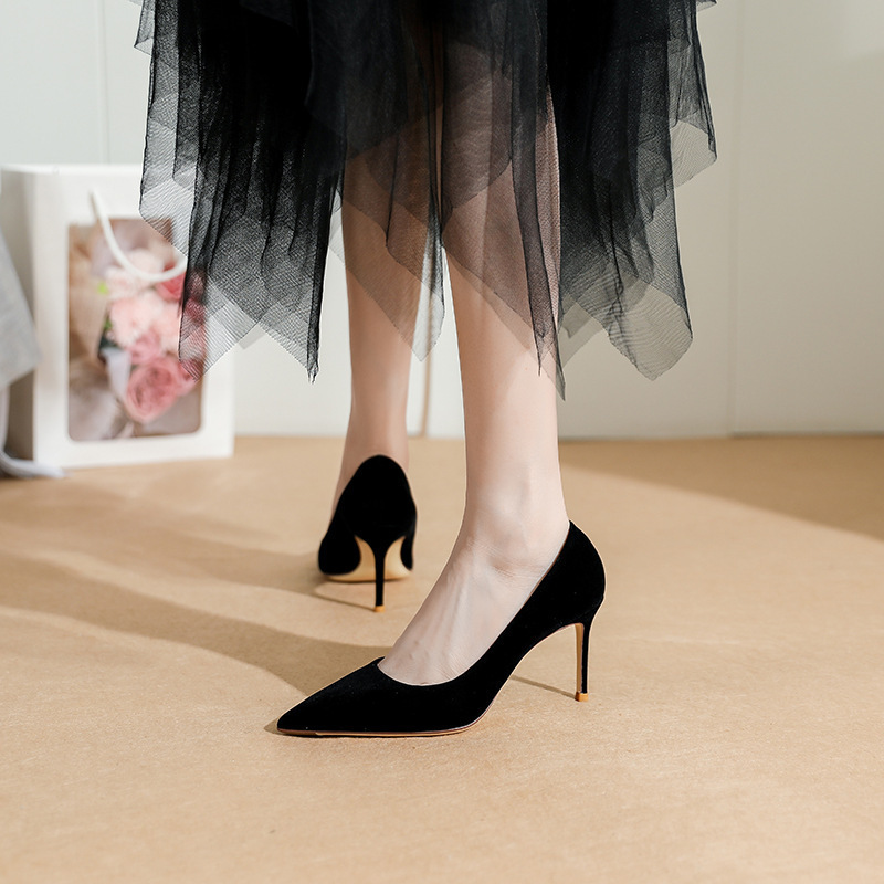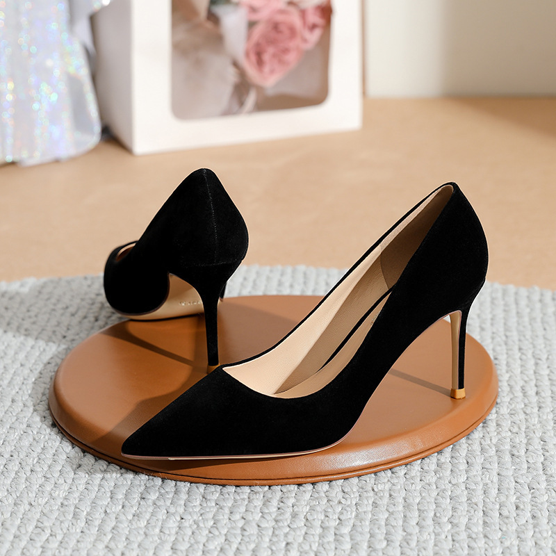 하이힐 여성 2025 년 봄 새로운 프렌치 스웨이드 뾰족한 발가락 얕은 입 스틸레토 힐 신발 매일 통근 전문 신발스토어 가기