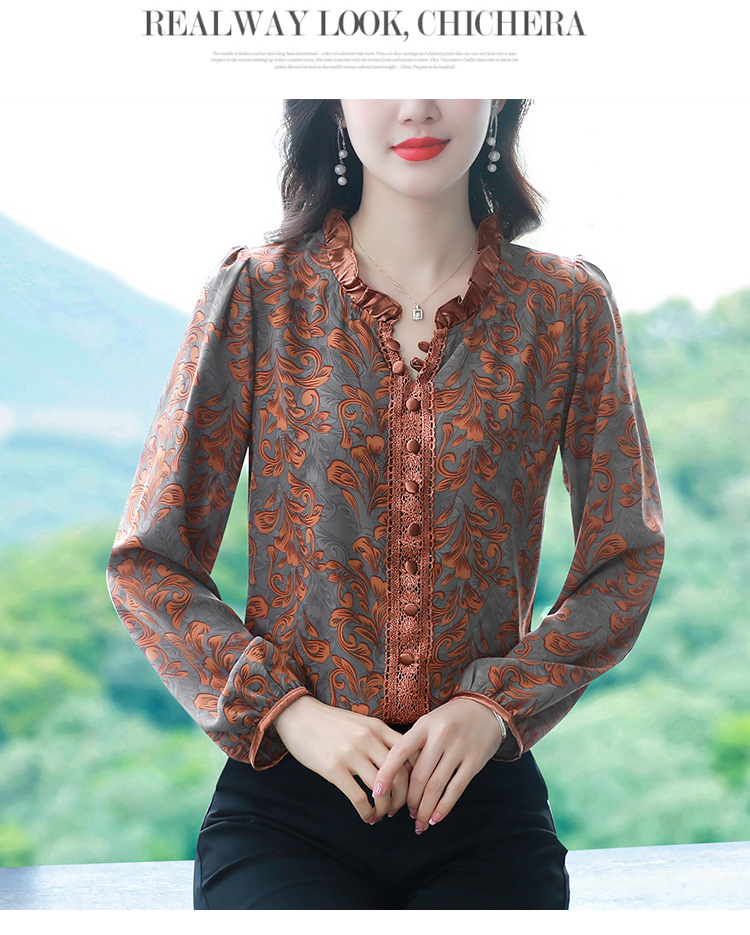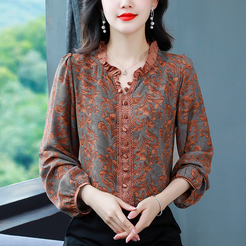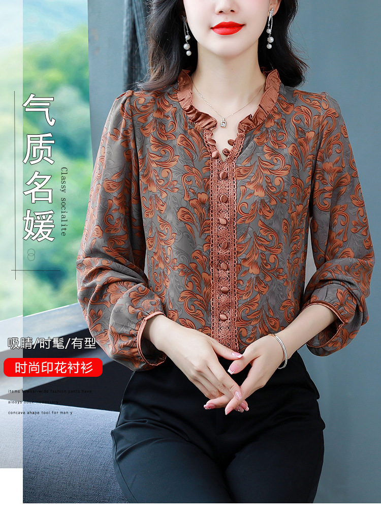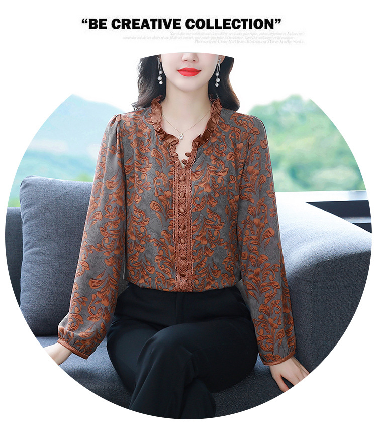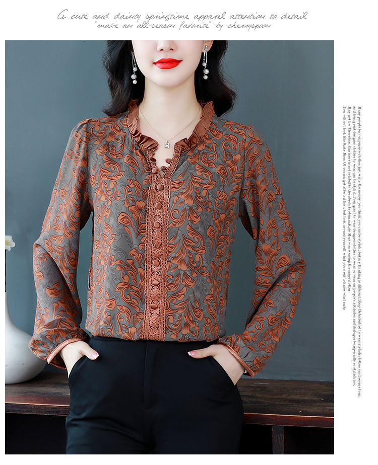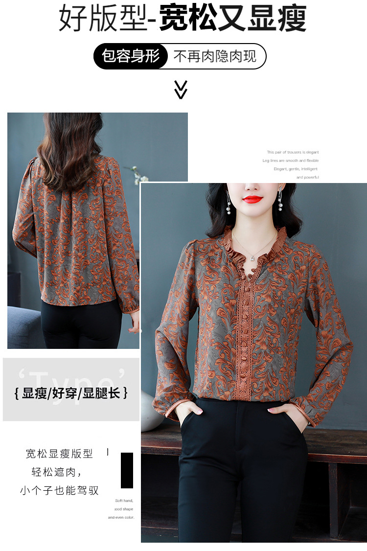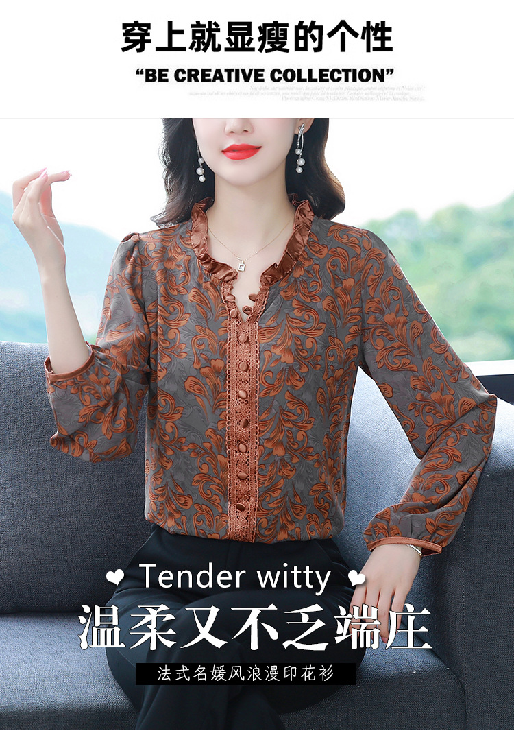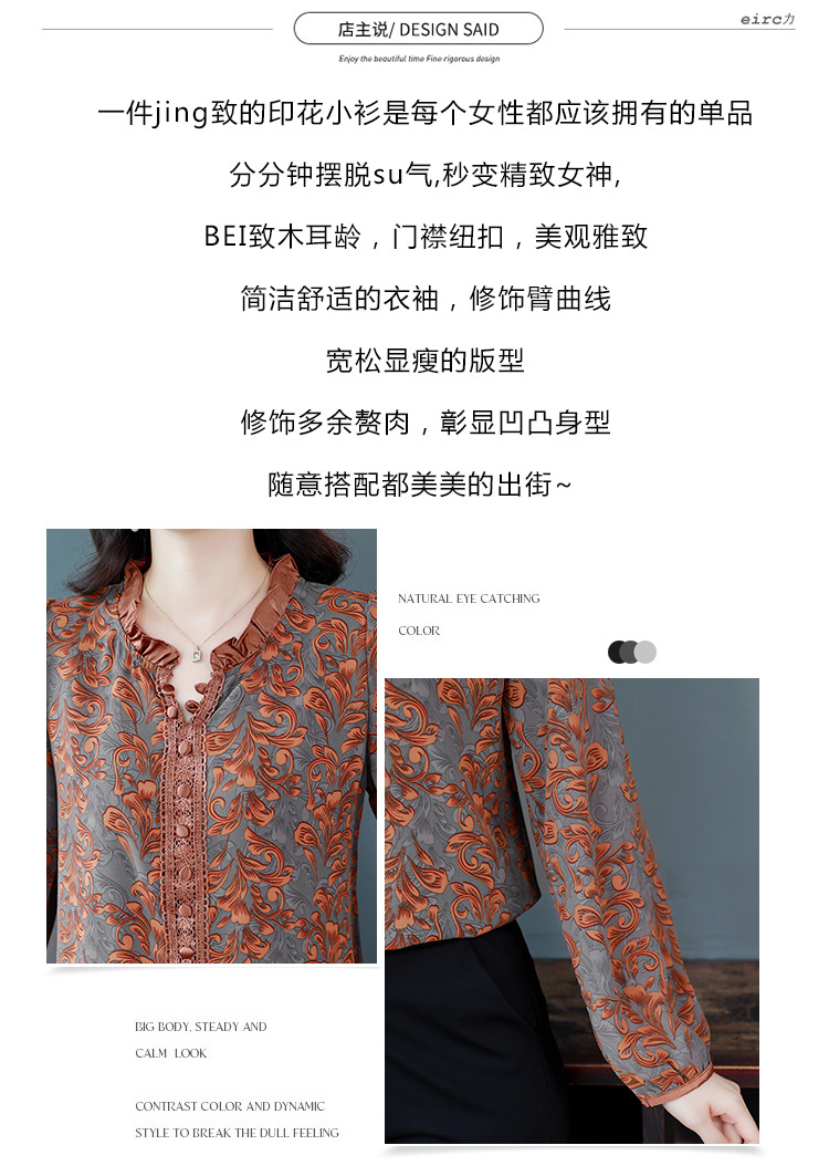 리얼 샷 하이 그레이드 뽕나무 실크 2023 가을 신작 긴팔 연잎 칼라 레이스 스티칭 기질 연령 감소 올매치 탑스토어 가기