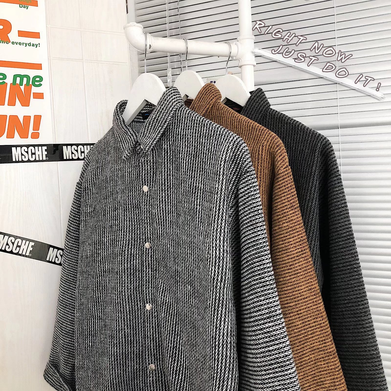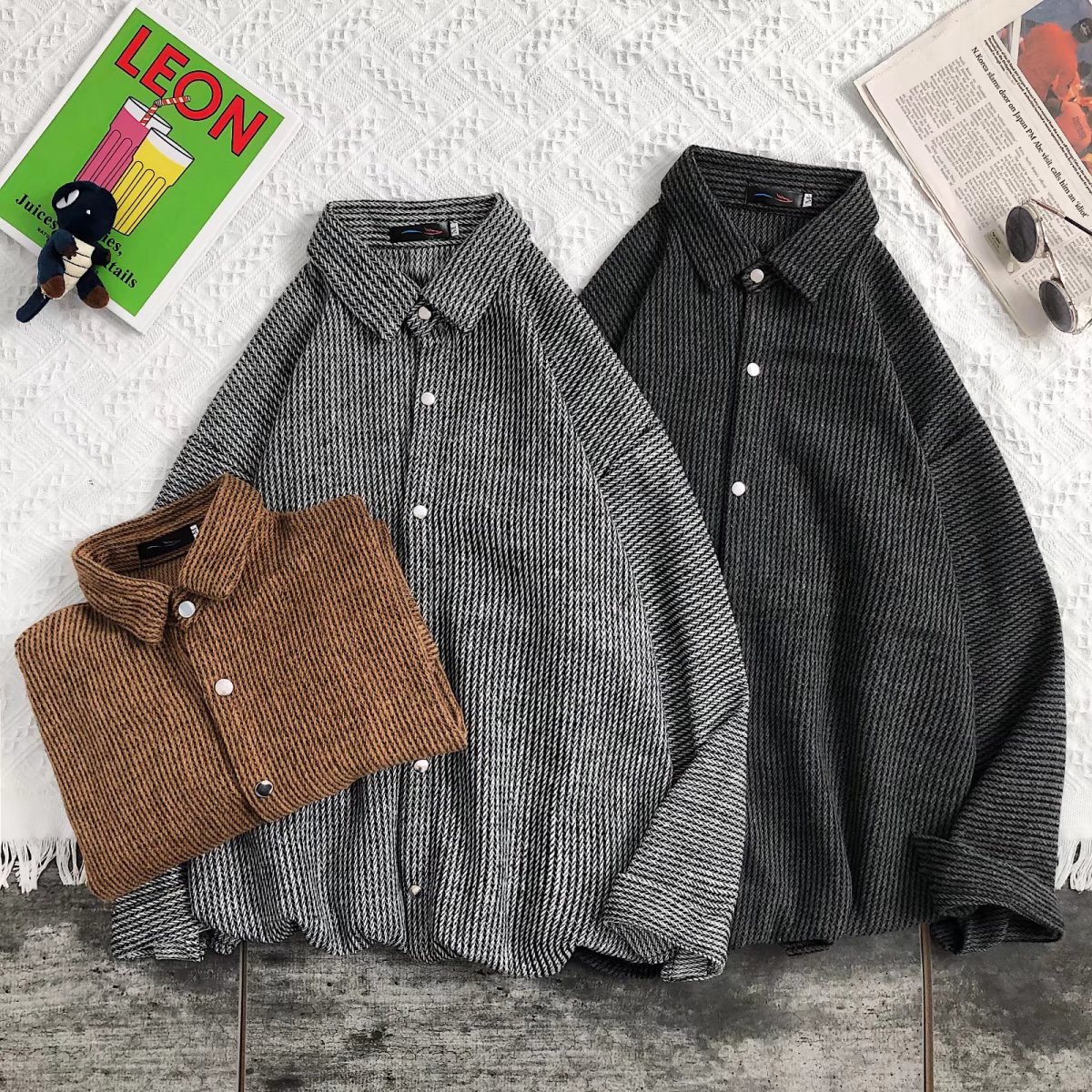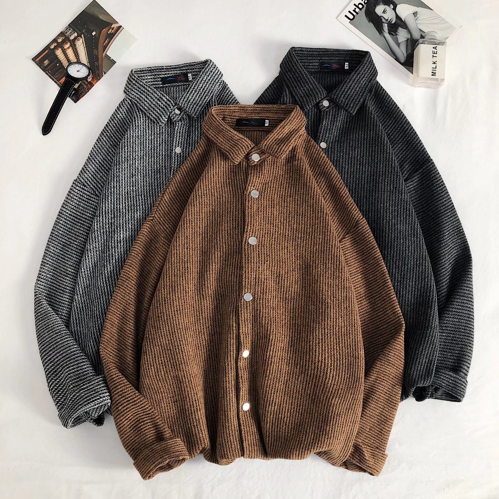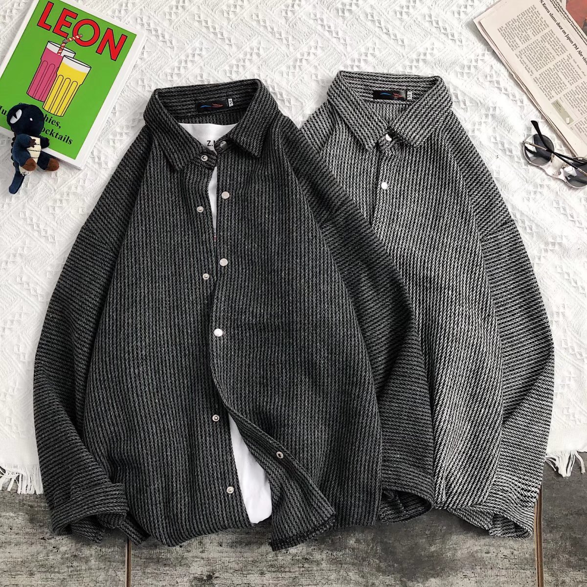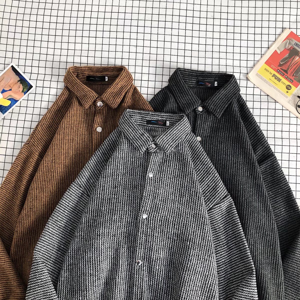 봄과 가을 일본 스타일 복고풍 느슨한 재킷 남자의 홍콩 스타일 한국 스타일 bf 하라주쿠 스타일 단색 긴 소매 모직 셔츠 재킷 남자의스토어 가기
