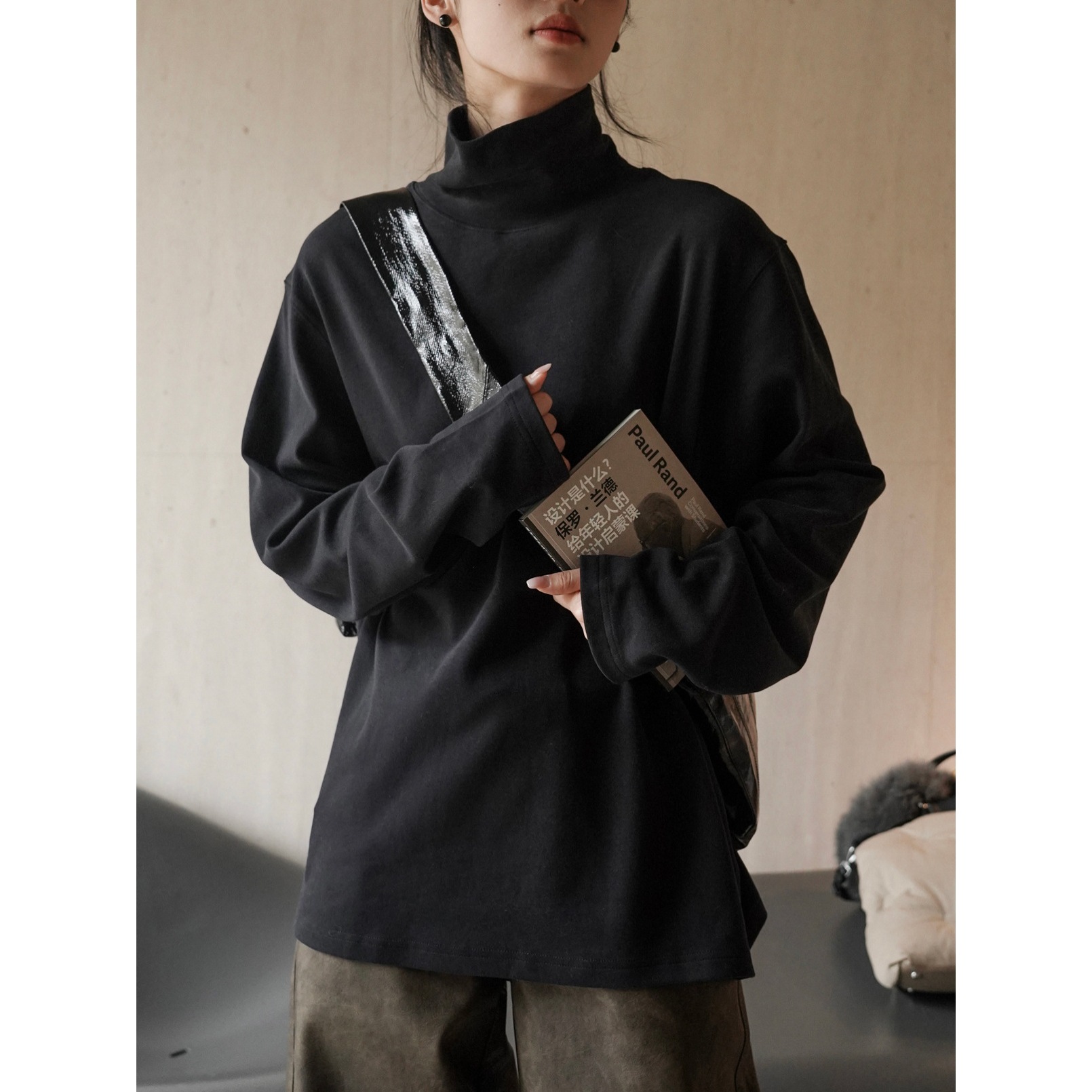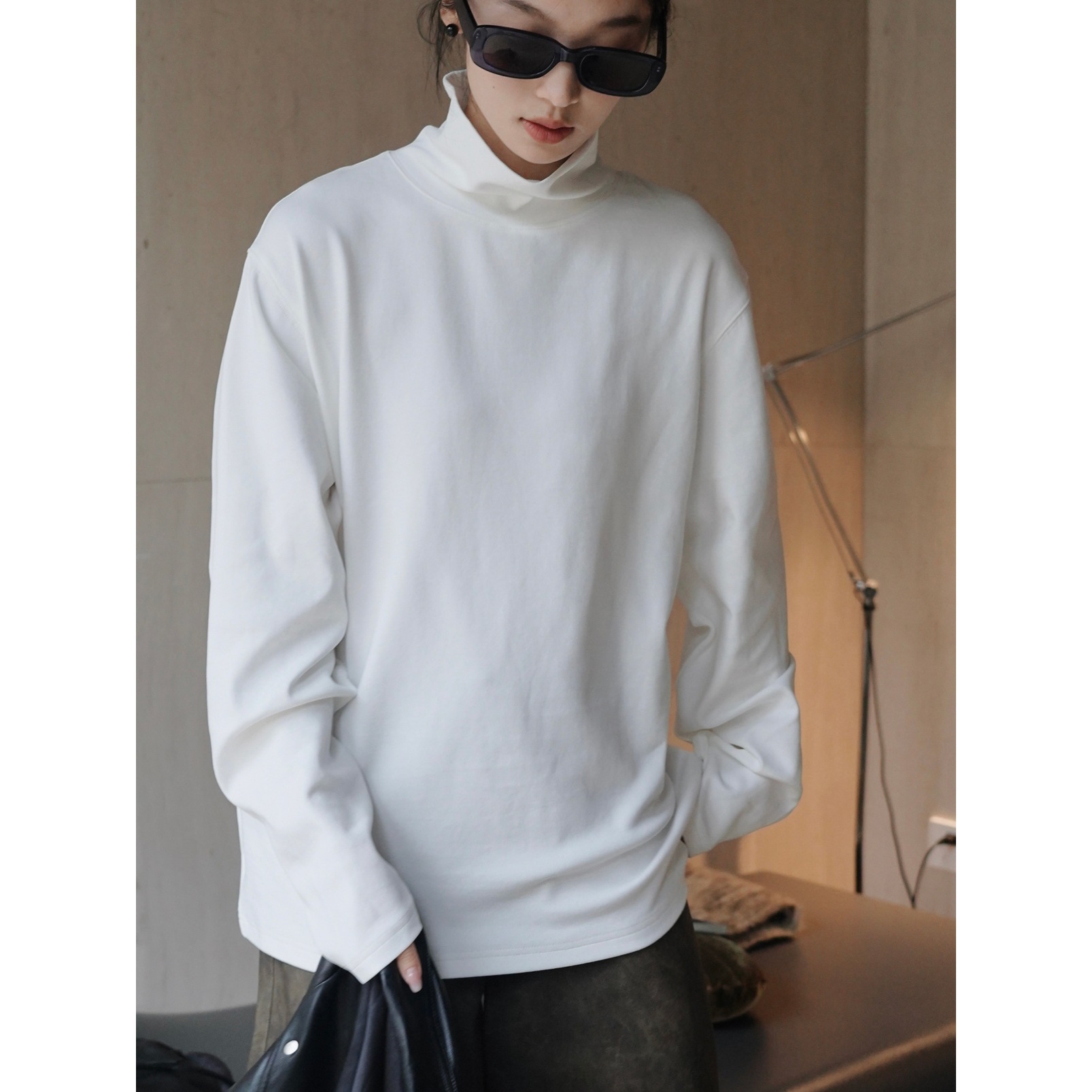 Lufu 겨울 새로운 일본 캐주얼 샌딩 하이 넥베이스 티셔츠 여성용 느슨한 두꺼운 따뜻한 소프트 탑