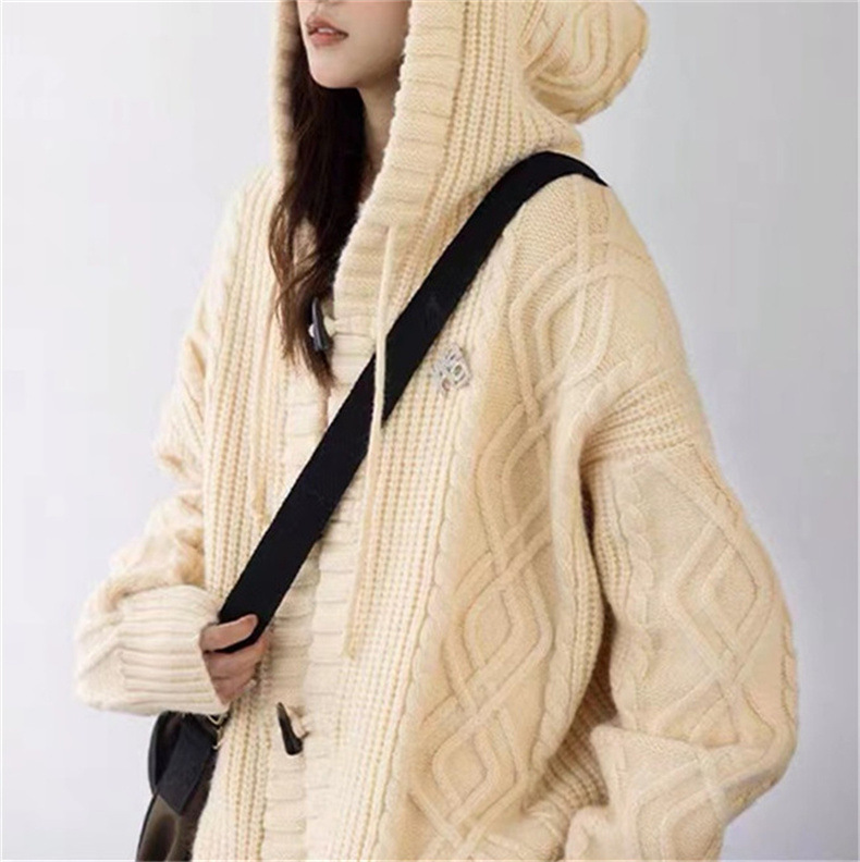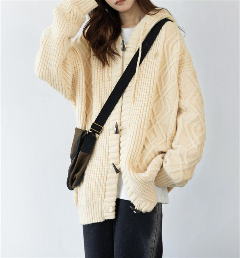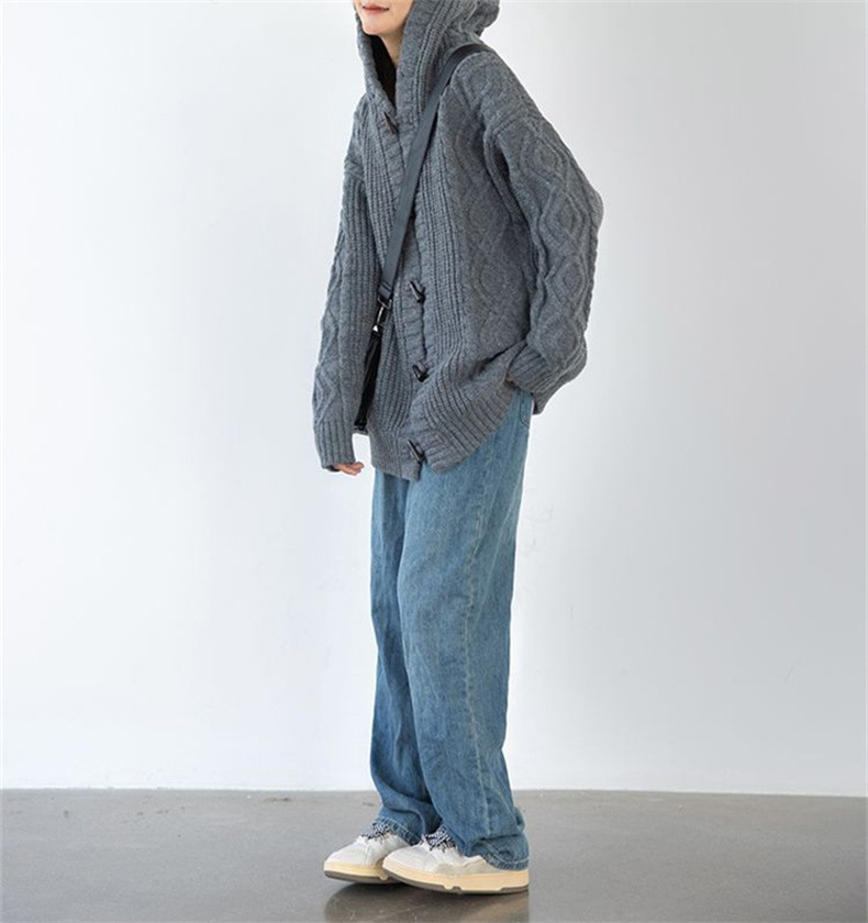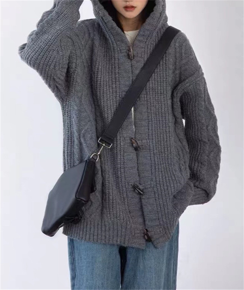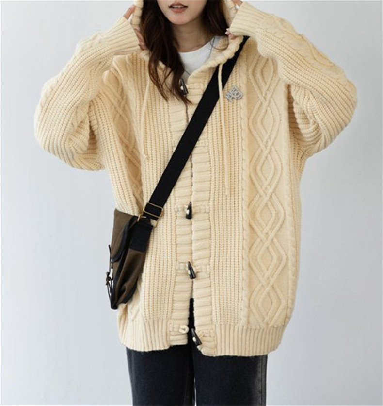가을과 겨울 새로운 레트로 혼 버클 후드 트위스트 스웨터 여성의 느슨한 게으른 스타일 니트 카디건 코트 최고 여성스토어 가기
