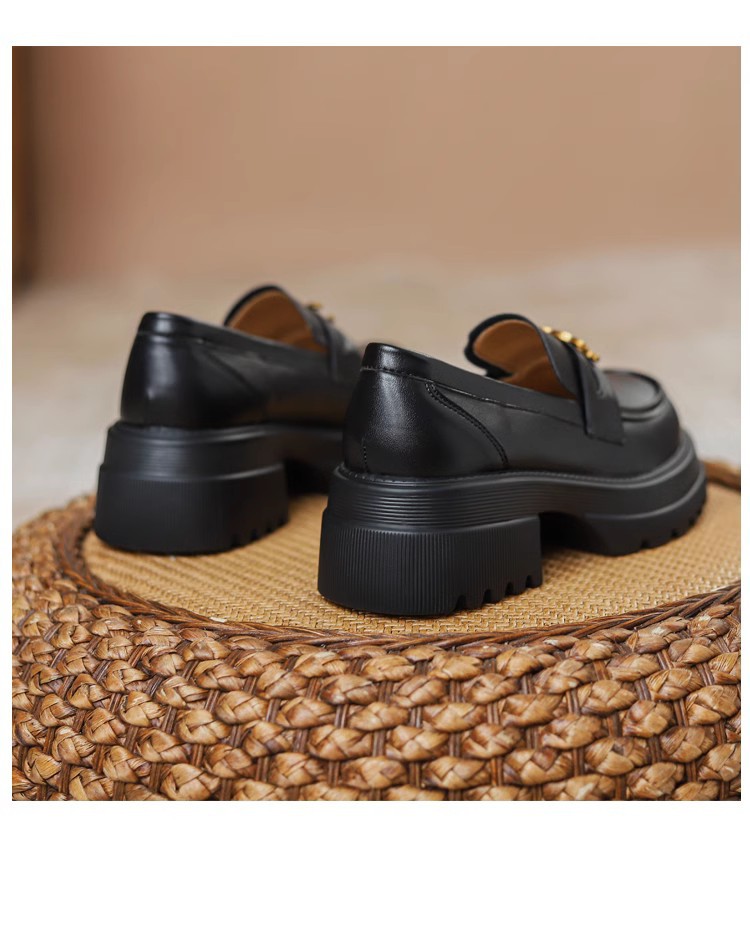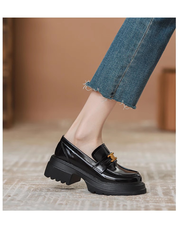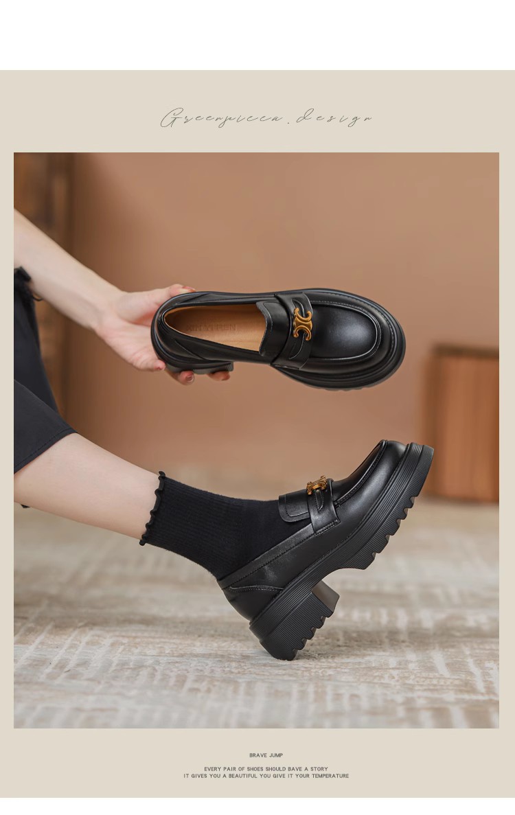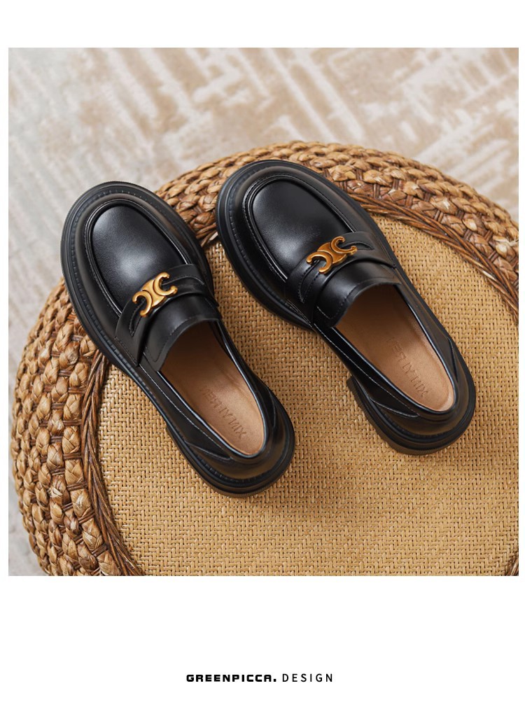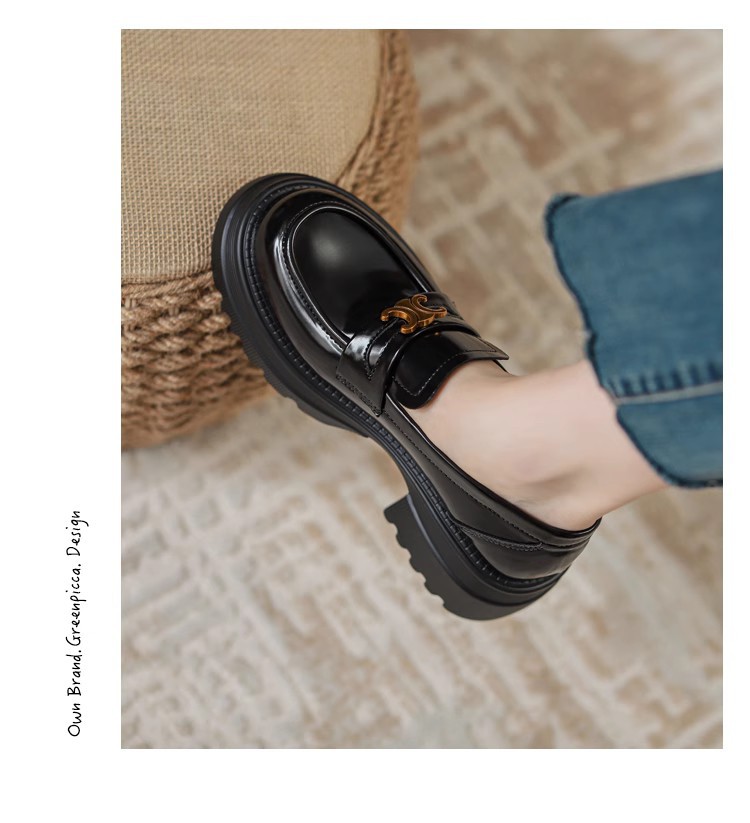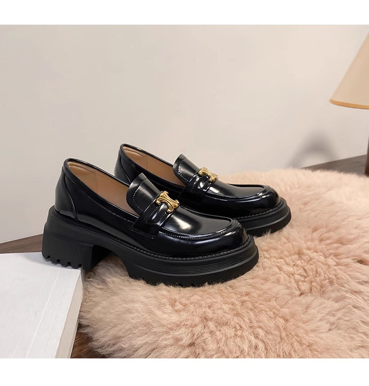 Arc de Triomphe 두꺼운 밑창 로퍼 여성용 영국식 소형 가죽 신발 두꺼운 굽 높이 증가 신발 블랙 슬립온 가죽 싱글 슈즈