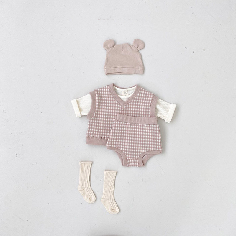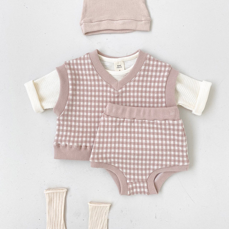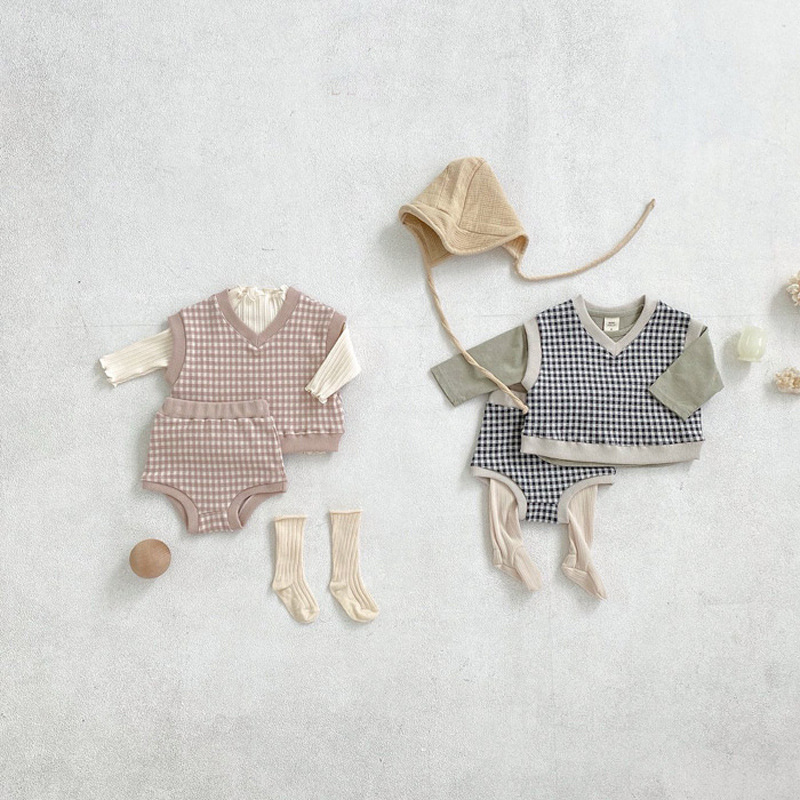 한국어 스타일의 아기 아기 가을 귀여운 세트 격자 무늬 조끼 반바지 세련된 투피스 세트스토어 가기