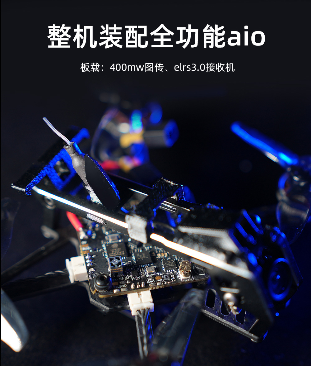 板载SPI elrs3.0接收机,内置天线,可外接黑羊接收机,定制微型T形天线,减轻重量;