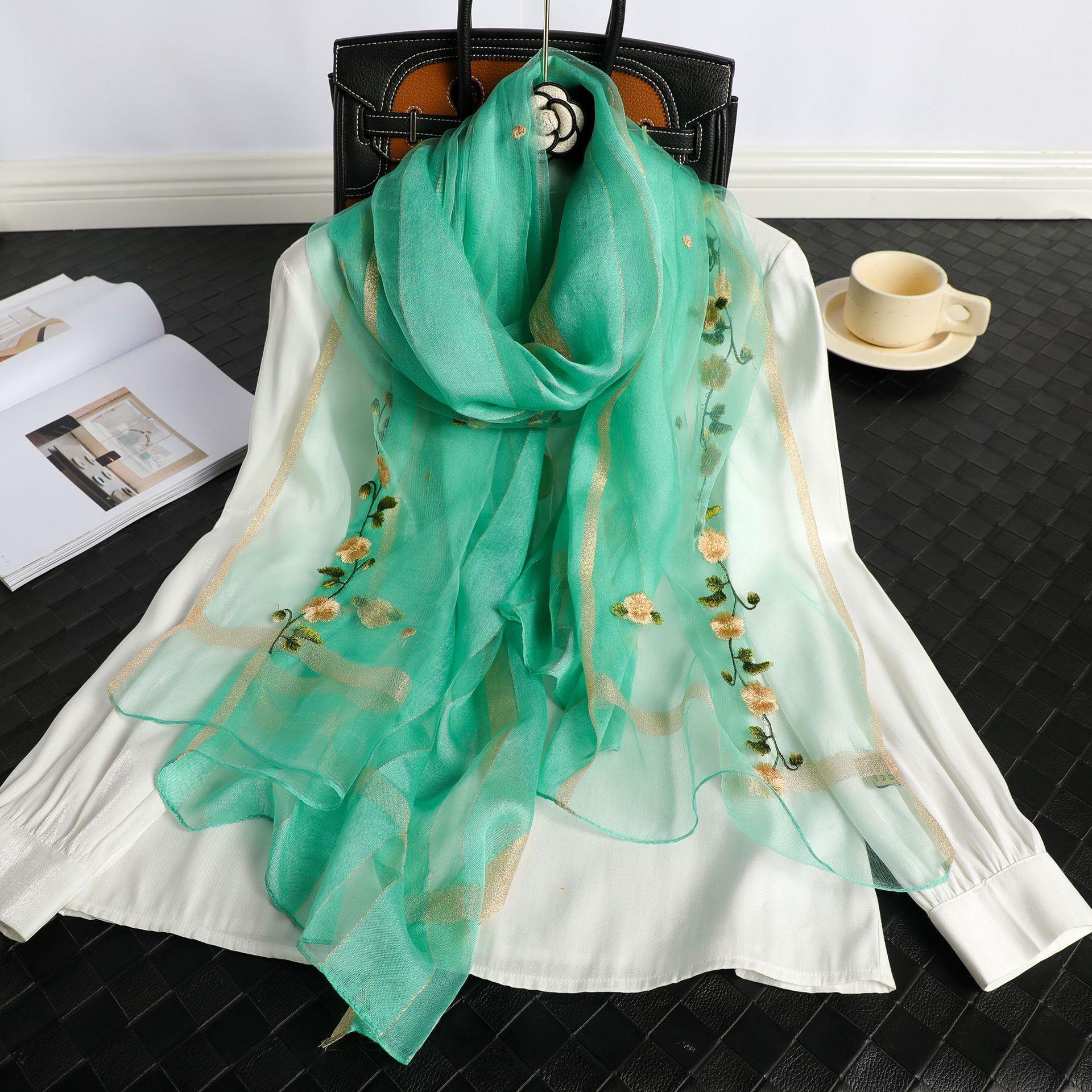 봄과 가을 새로운 실크 스카프 여성 얇은 실크 스카프 서양 스타일 패션 연회 숄 자수 자외선 차단제 스카프 도매스토어 가기