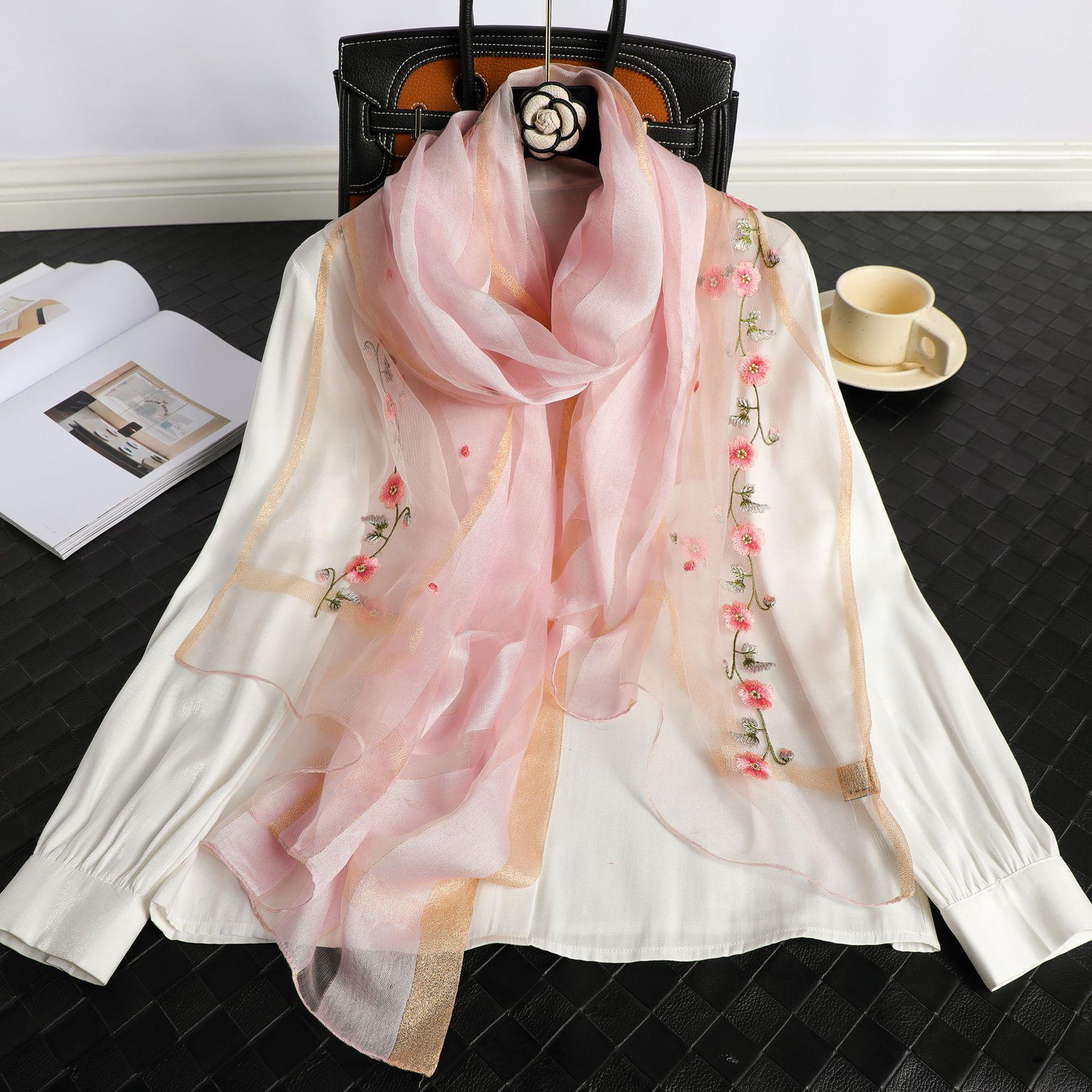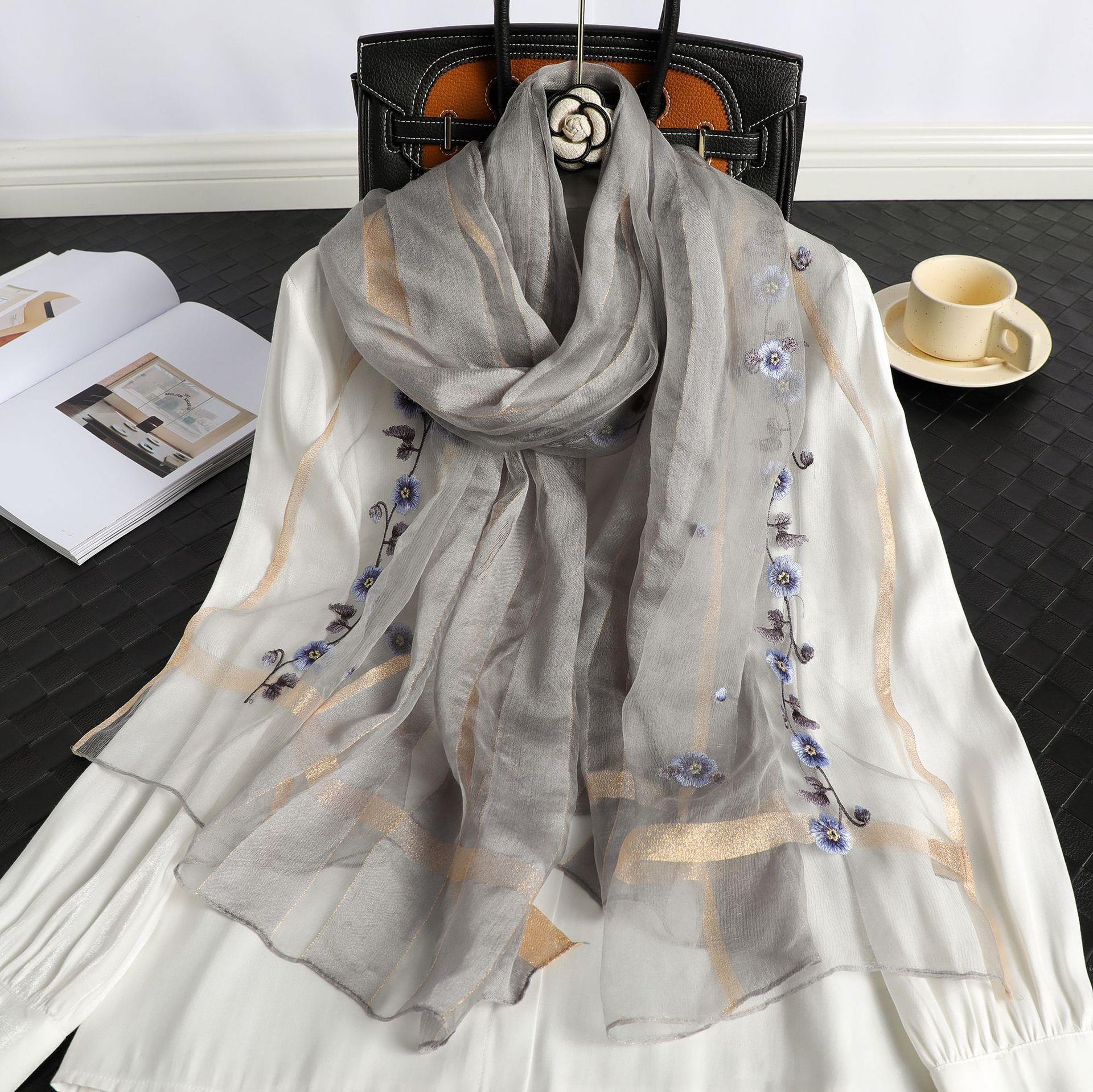 봄과 가을 새로운 실크 스카프 여성 얇은 실크 스카프 서양 스타일 패션 연회 숄 자수 자외선 차단제 스카프 도매