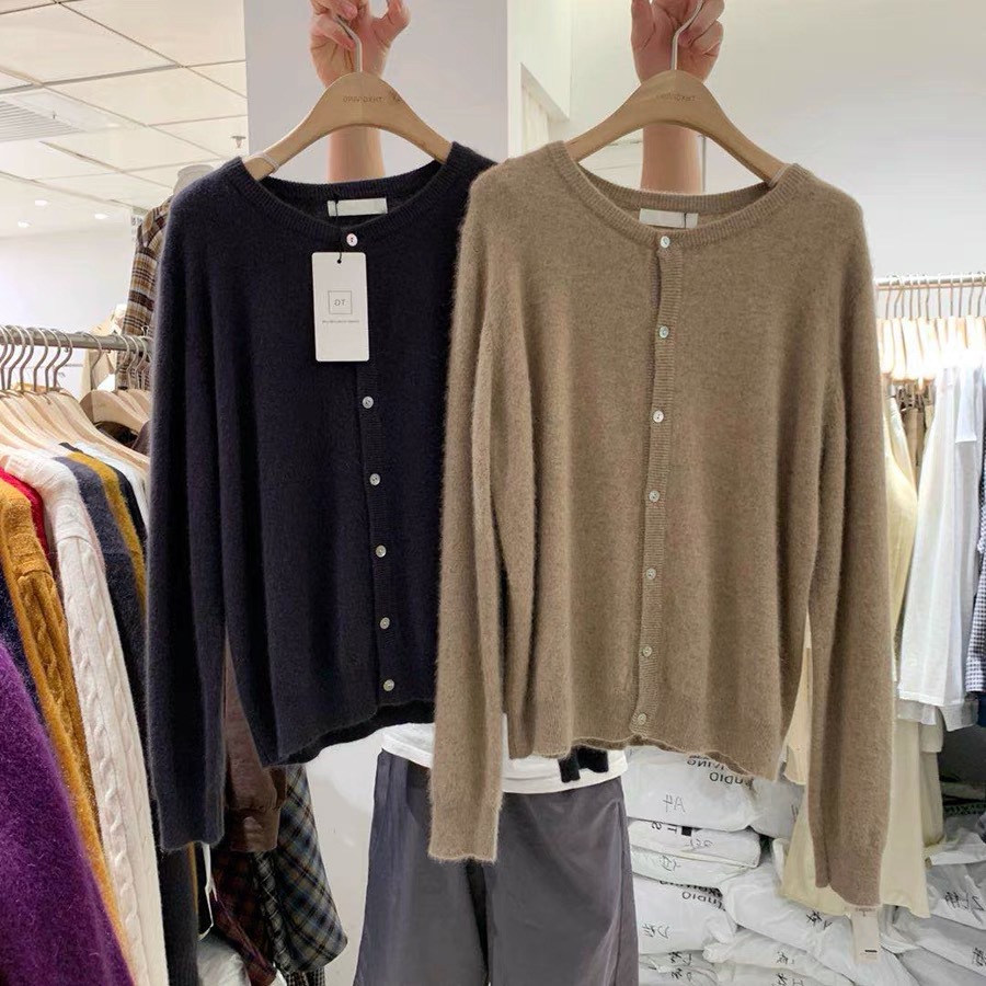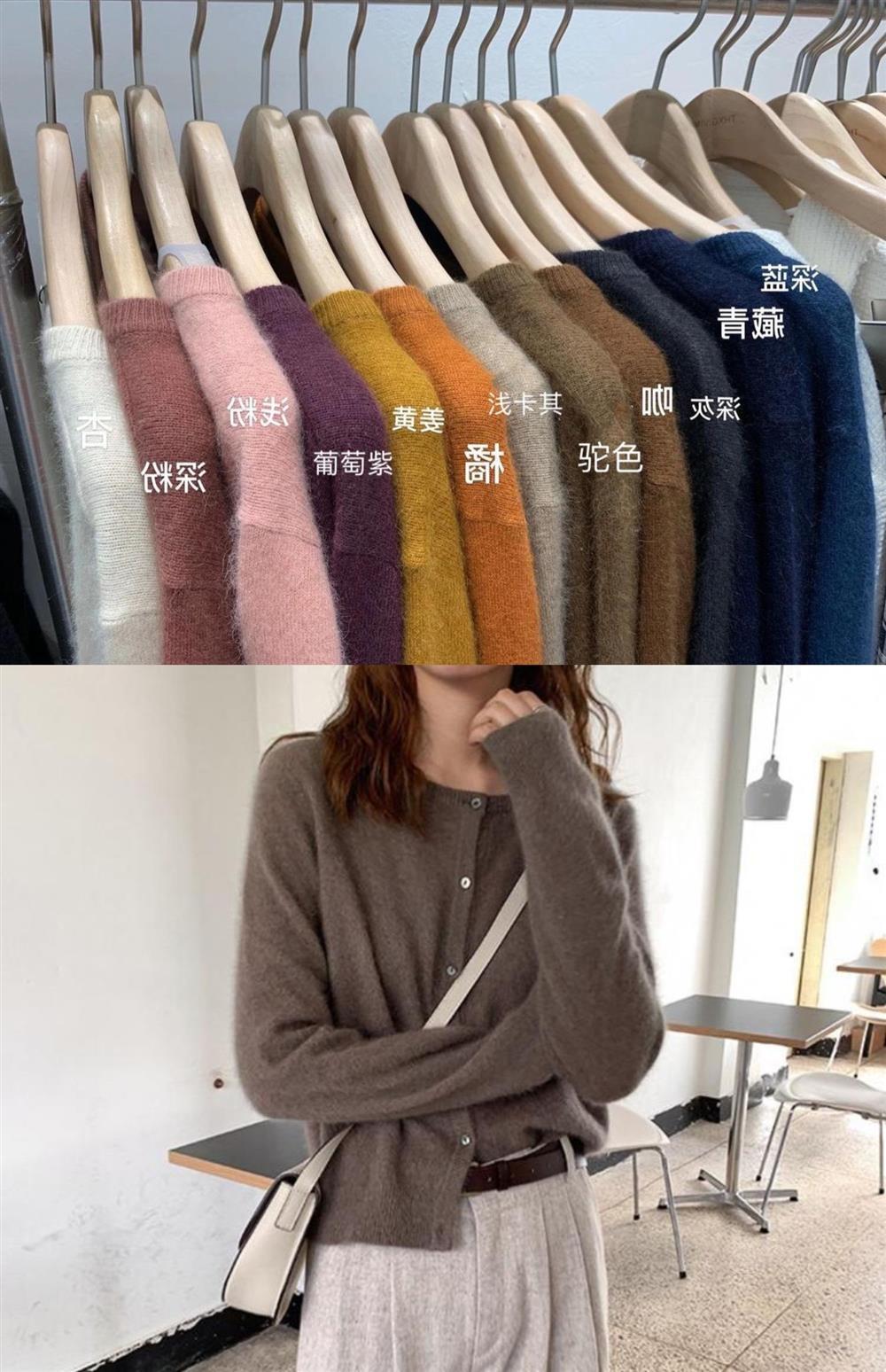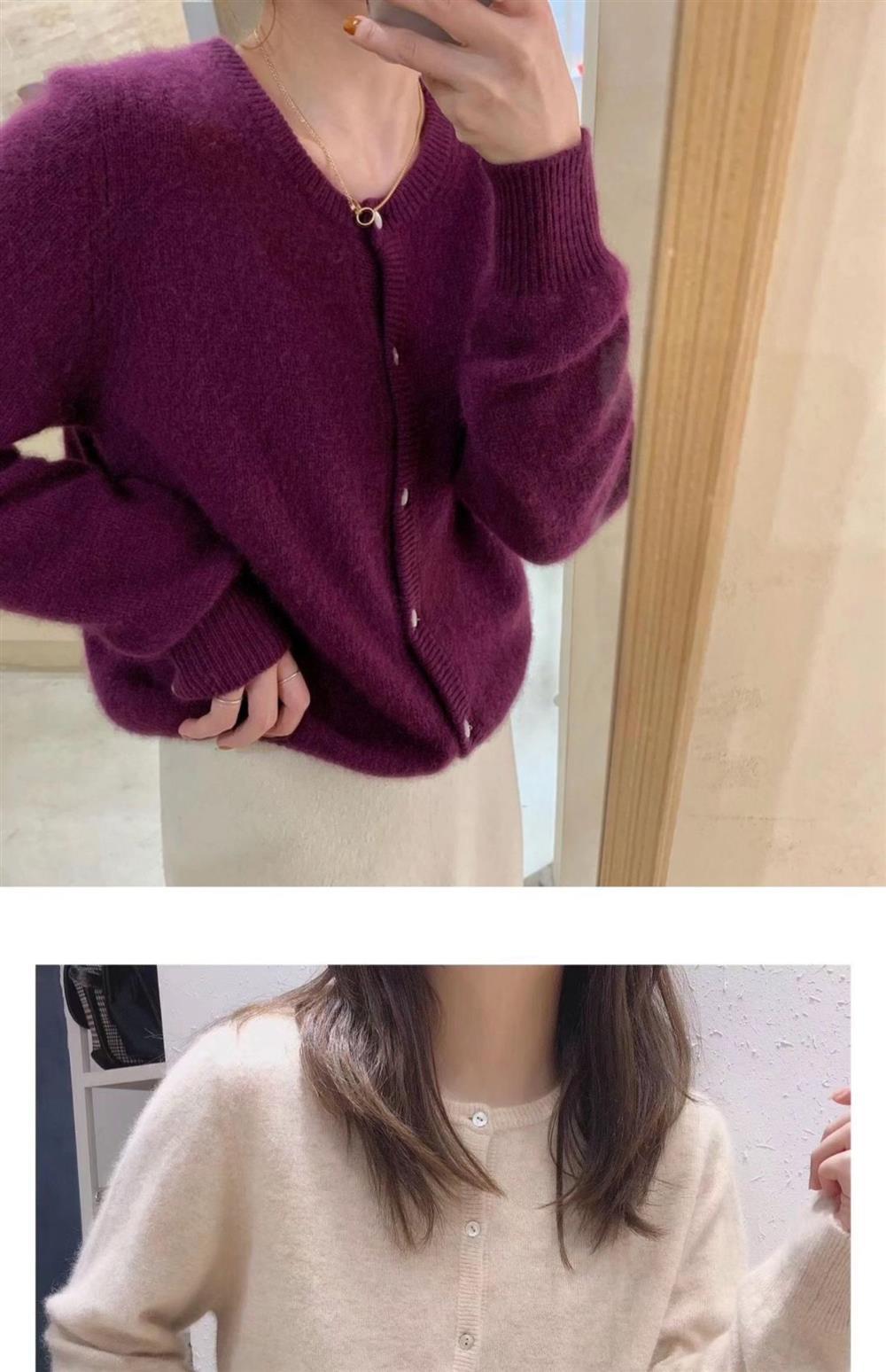 재고 너구리 머리 봄과 가을 새로운 라운드 넥 퍼플 짧은 니트 작은 카디건 느슨한 겉옷 스웨터 코트 여성용스토어 가기