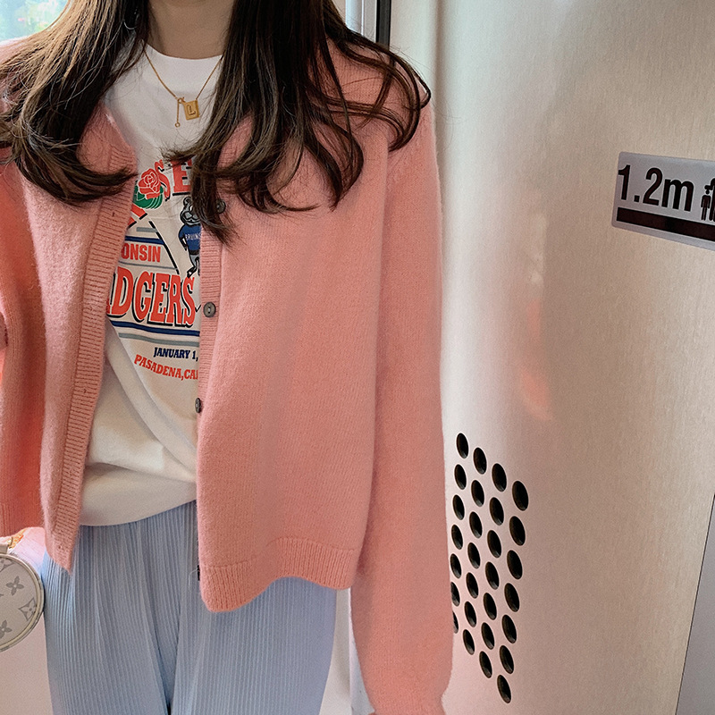재고 너구리 머리 봄과 가을 새로운 라운드 넥 퍼플 짧은 니트 작은 카디건 느슨한 겉옷 스웨터 코트 여성용