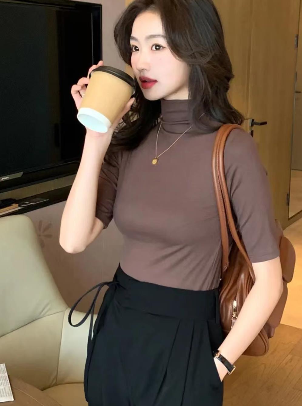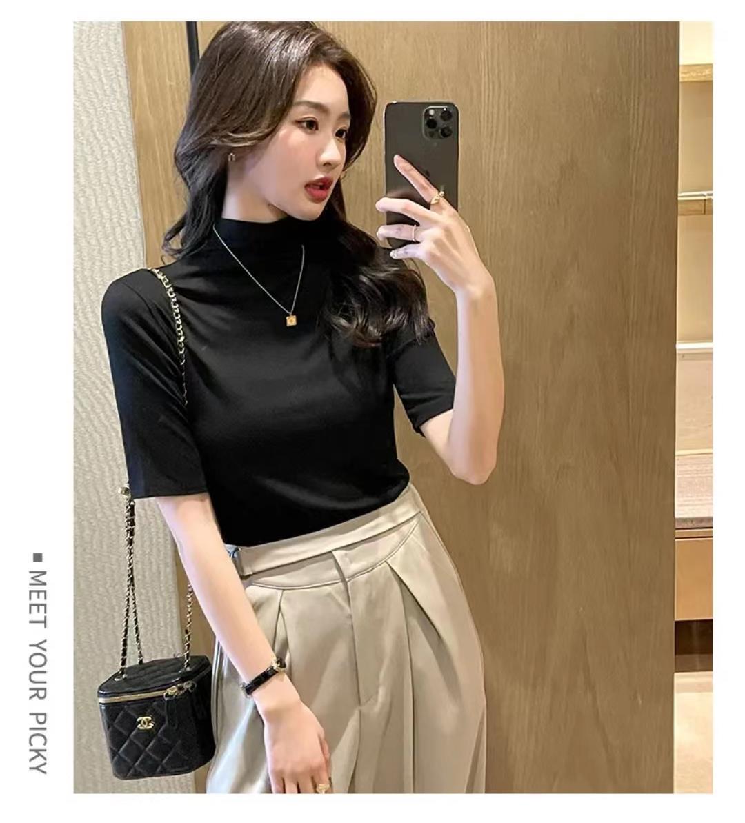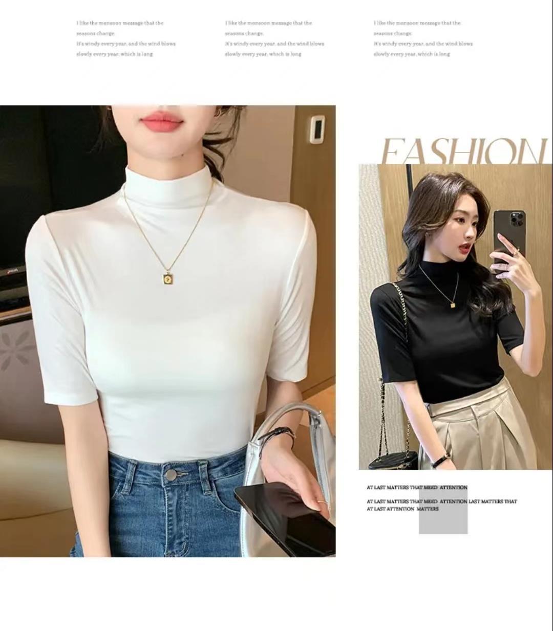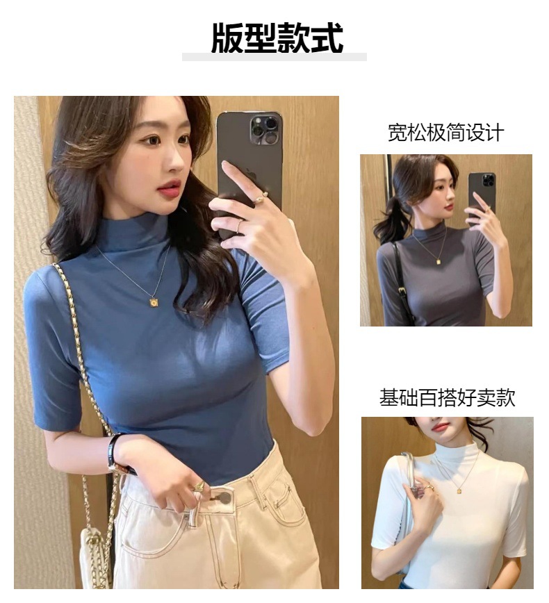가을과 겨울 스몰 스탠드 칼라 반팔 티셔츠 여성용 초가을 새로운 한국식 슬림핏 하프 하이 칼라 5 점 슬리브 단색 내부 탑스토어 가기