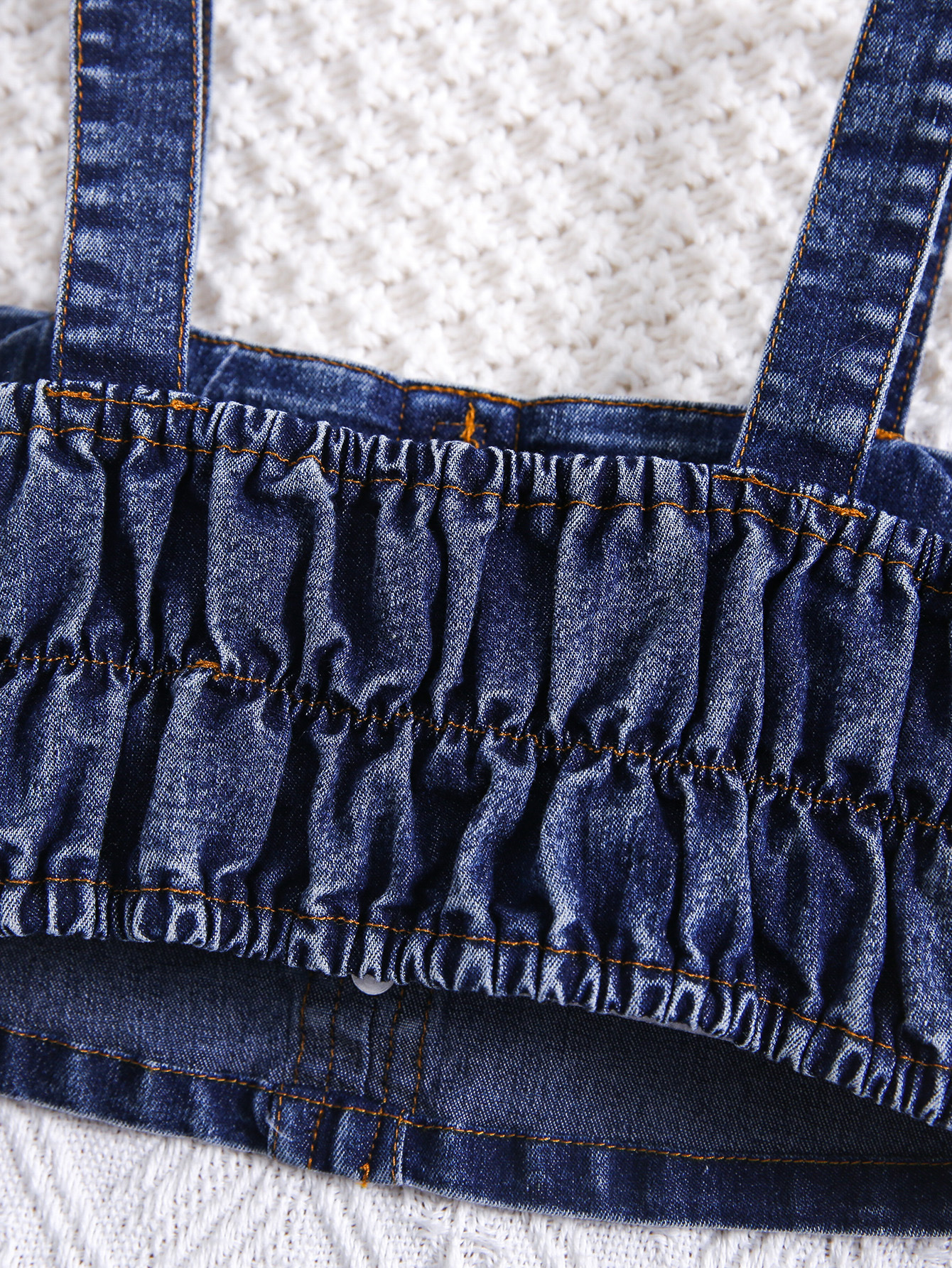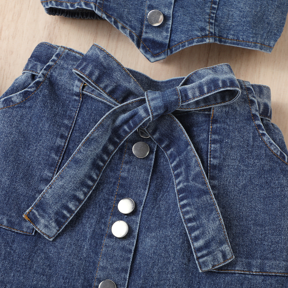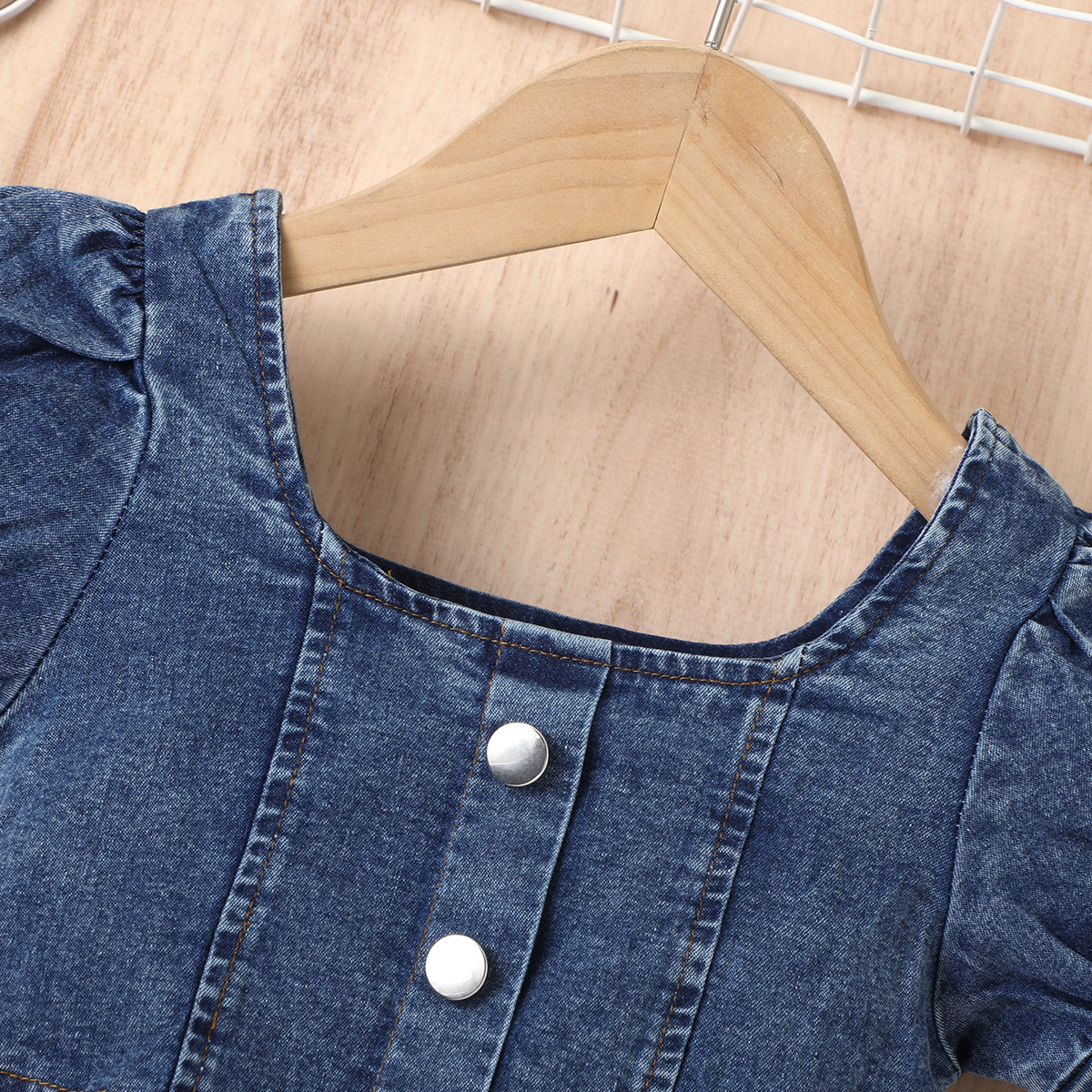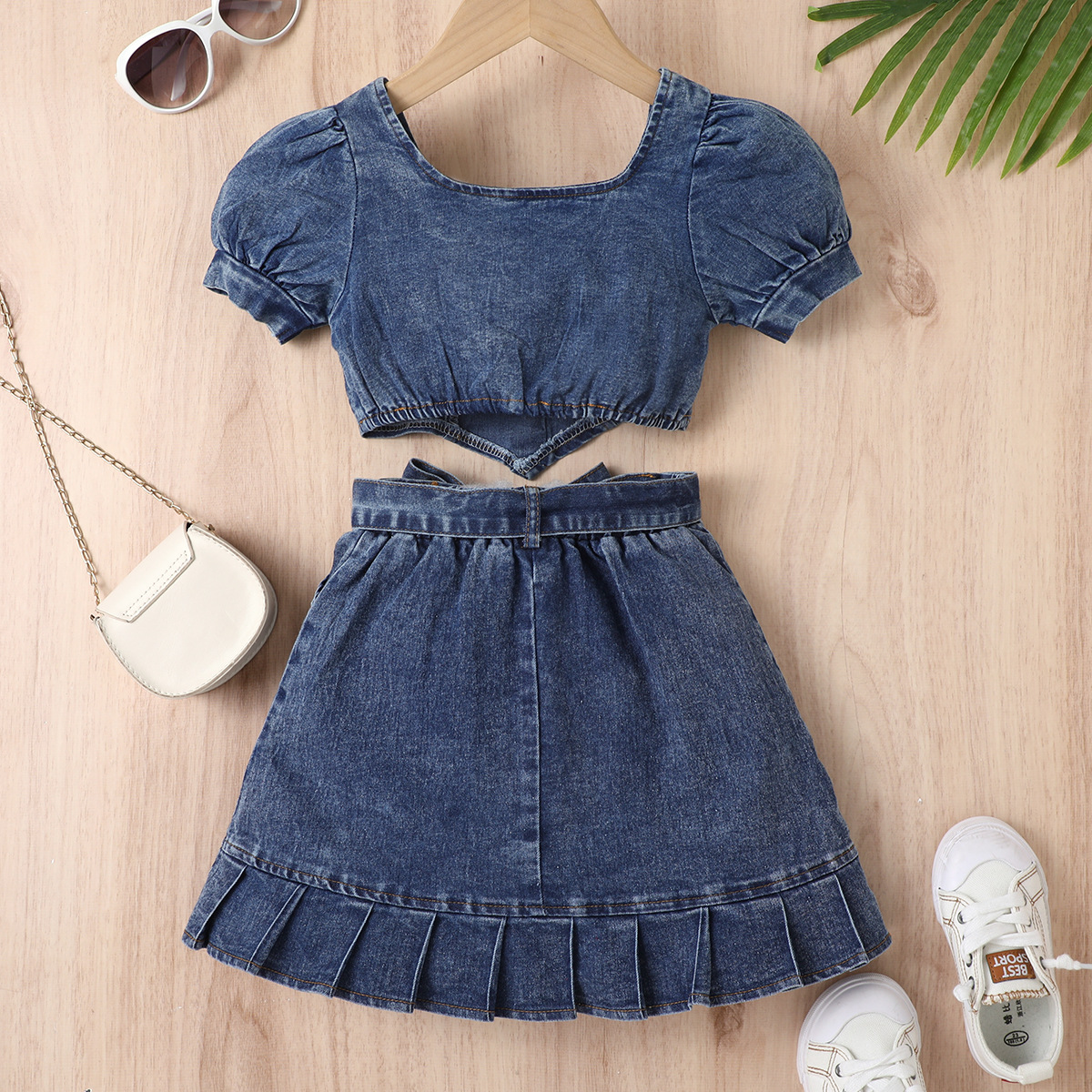 유럽과 미국의 국경 간 아동복 소녀 광장 칼라 랜턴 슬리브 상단 파편 패턴 주름 스커트 멀티 버튼 데님 소녀복 세트
